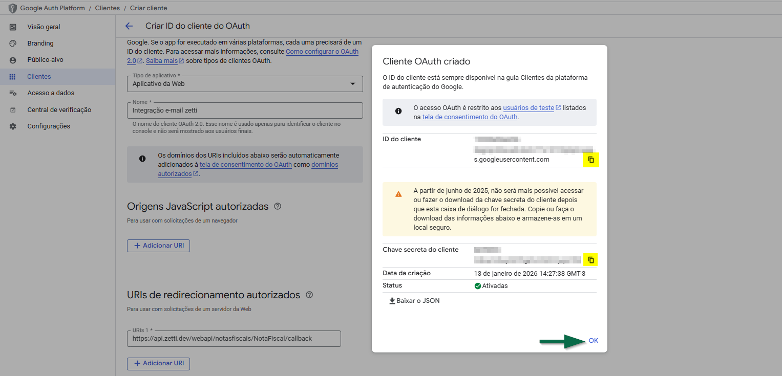 Feito isso, uma nova tela será exibida informando que o cliente OAuth foi criado com sucesso, destacando o "ID do cliente" (Client ID) e a "Chave secreta do cliente" (Client Secret). Clique no botão copiar "