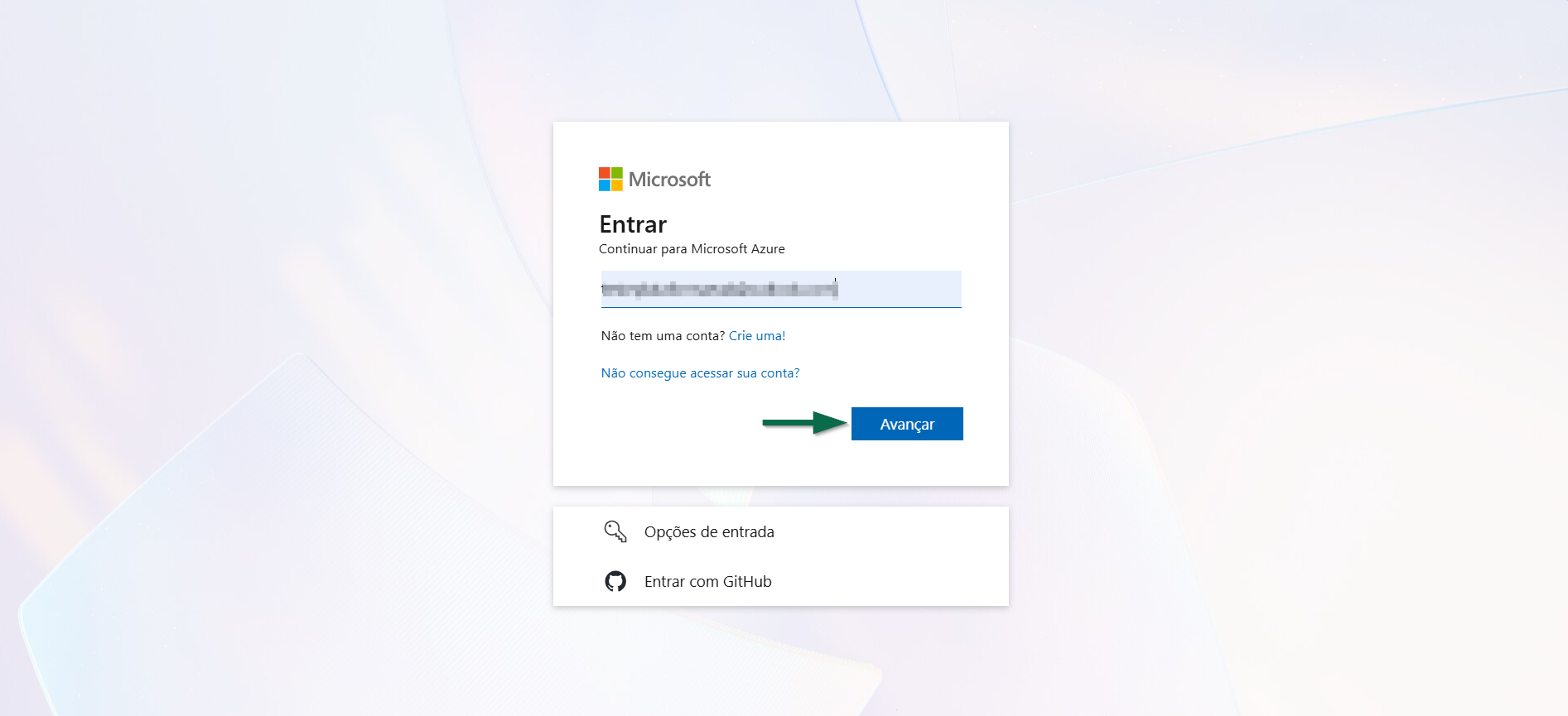 Após acessar o link do portal Azure, caso o usuário já esteja logado em uma conta Microsoft, o sistema solicitará apenas a confirmação do acesso. Caso contrário, será necessário informar o endereço de e-mail e, em seguida, clicar em >> Avançar para inserir a senha e concluir o login.