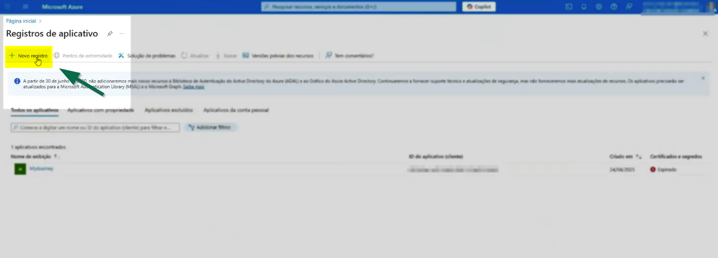 Ao acessar o Portal Azure, navegue até >> Azure Active Directory e, em seguida, clique em >> Registros de aplicativos. Na tela exibida, clique na opção >> Novo registro para iniciar o cadastro da aplicação.