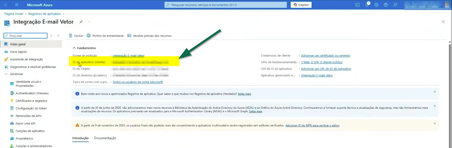 Após concluir o registro do aplicativo, o sistema exibirá a tela com as informações do app criado. Nela, localize o campo "ID do aplicativo (cliente)", copie o valor apresentado e guarde-o, pois esse identificador corresponde ao "Client ID", que deverá ser informado posteriormente na tela de configuração de e-mail do sistema.