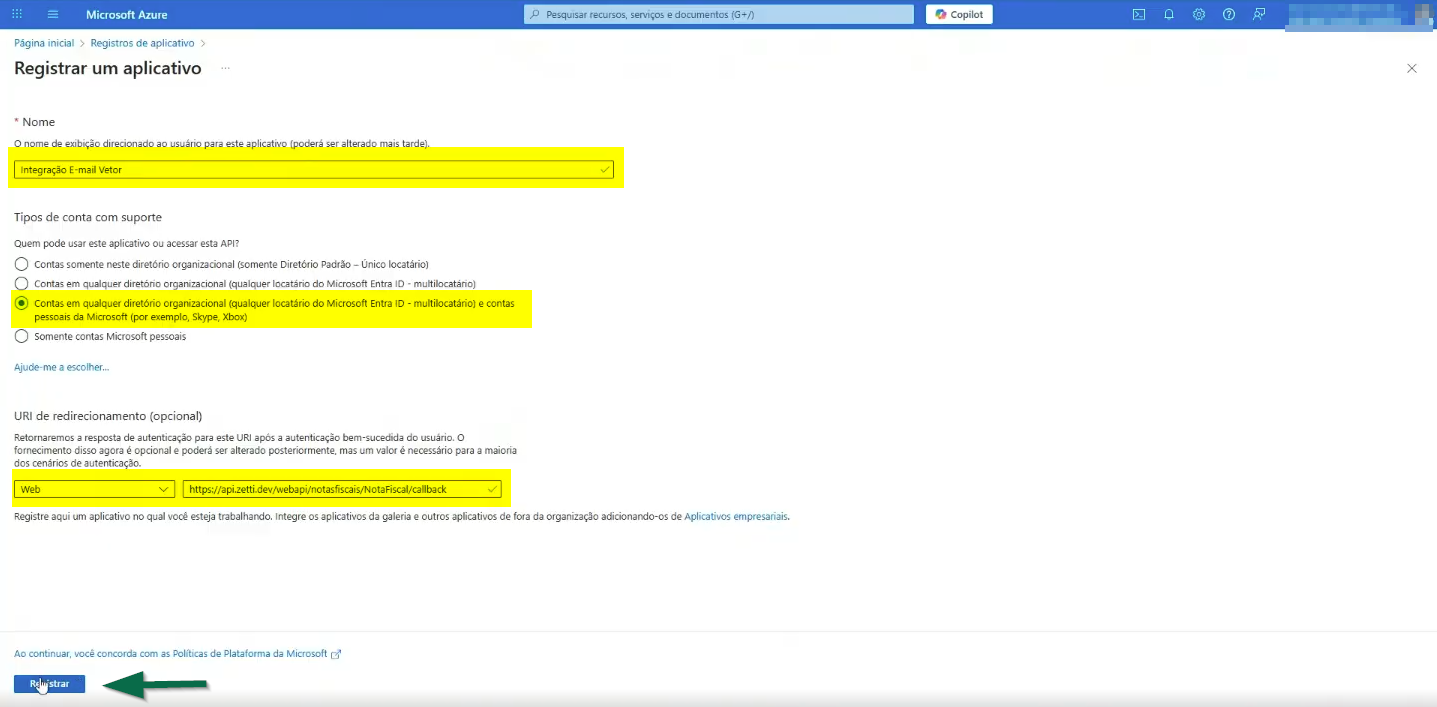 Na tela que será exibida "Registrar um aplicativo", preencha o campos em destaque da seguinte maneira: