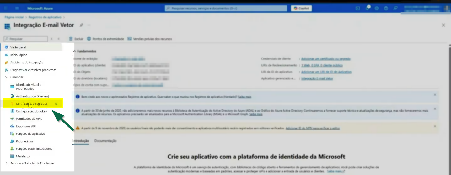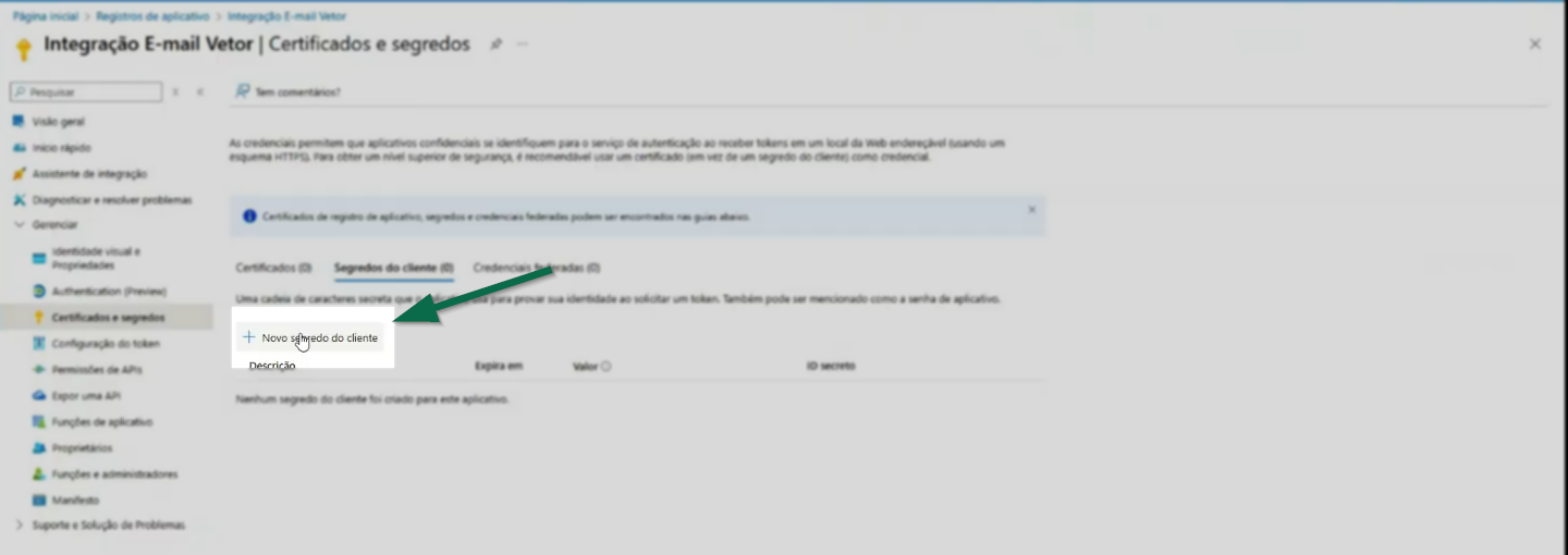 Por fim, para concluir a configuração, é necessário criar o "Client Secret'. No menu ao lado esquerdo da tela, acesse a opção "Certificados e Segredos".