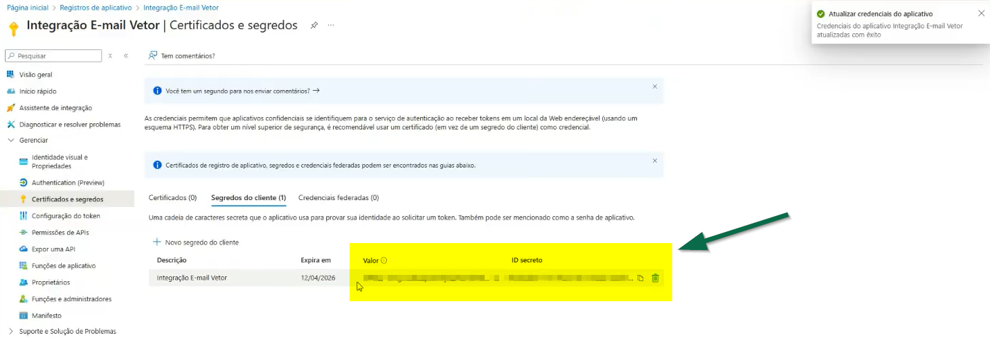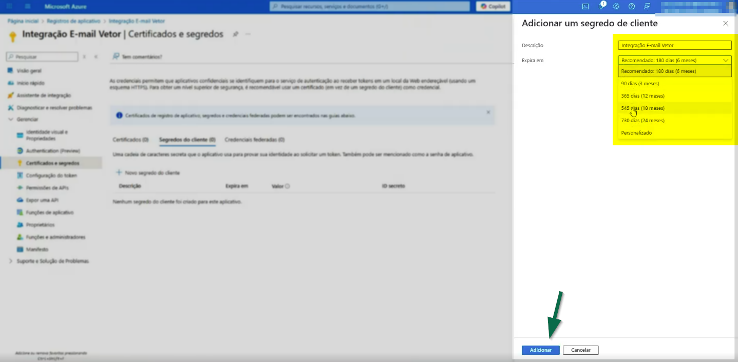 A Microsoft, por questões de segurança, estabelece prazos de expiração para os segredos do cliente. Por esse motivo, selecione o período mais adequado à sua operação e, quando o prazo expirar, retorne a essa tela para gerar um novo segredo e manter a integração em funcionamento.