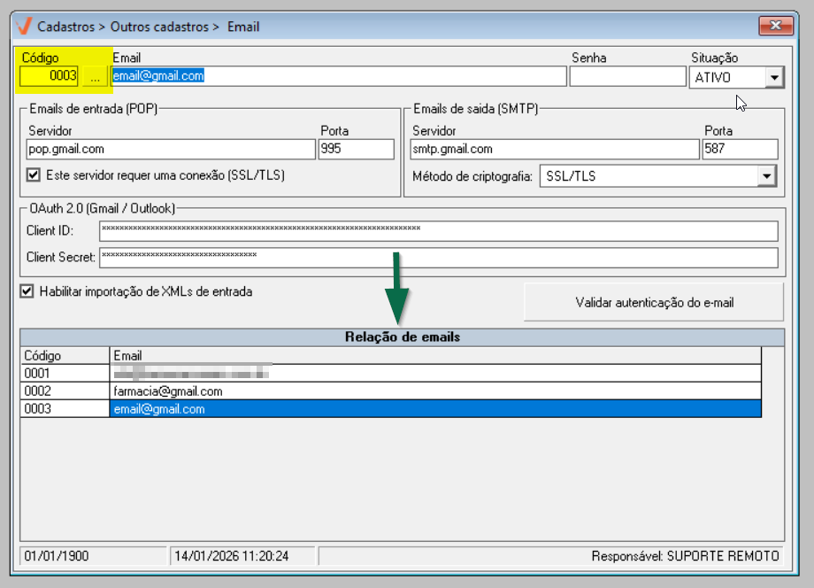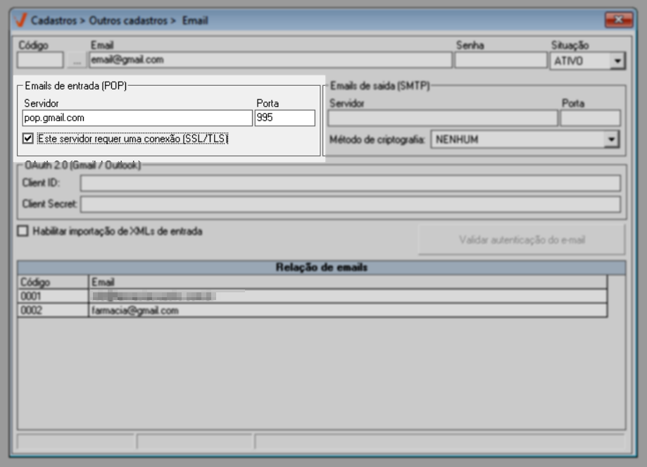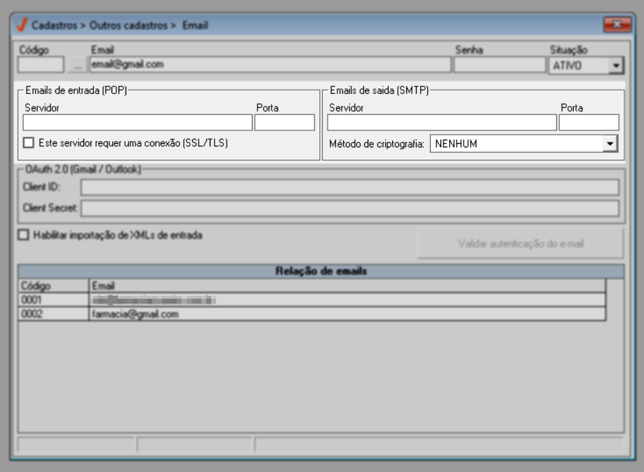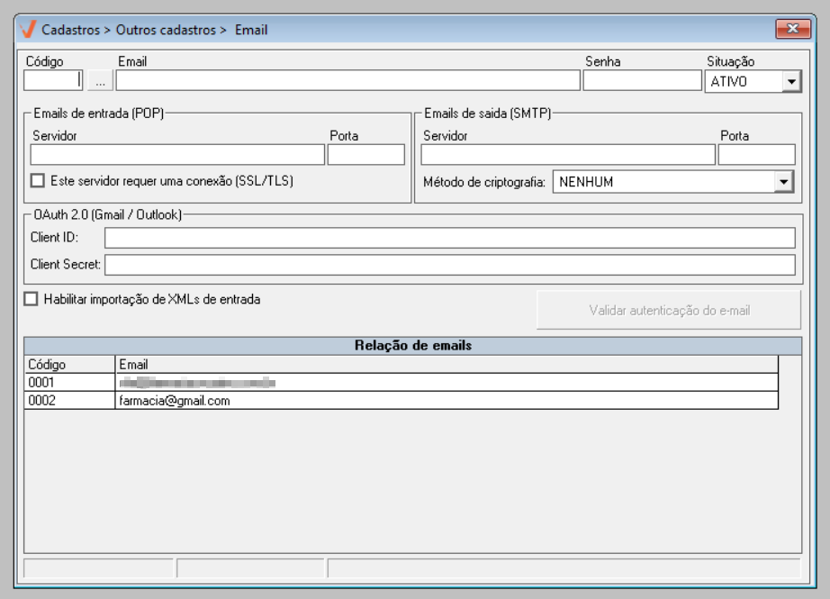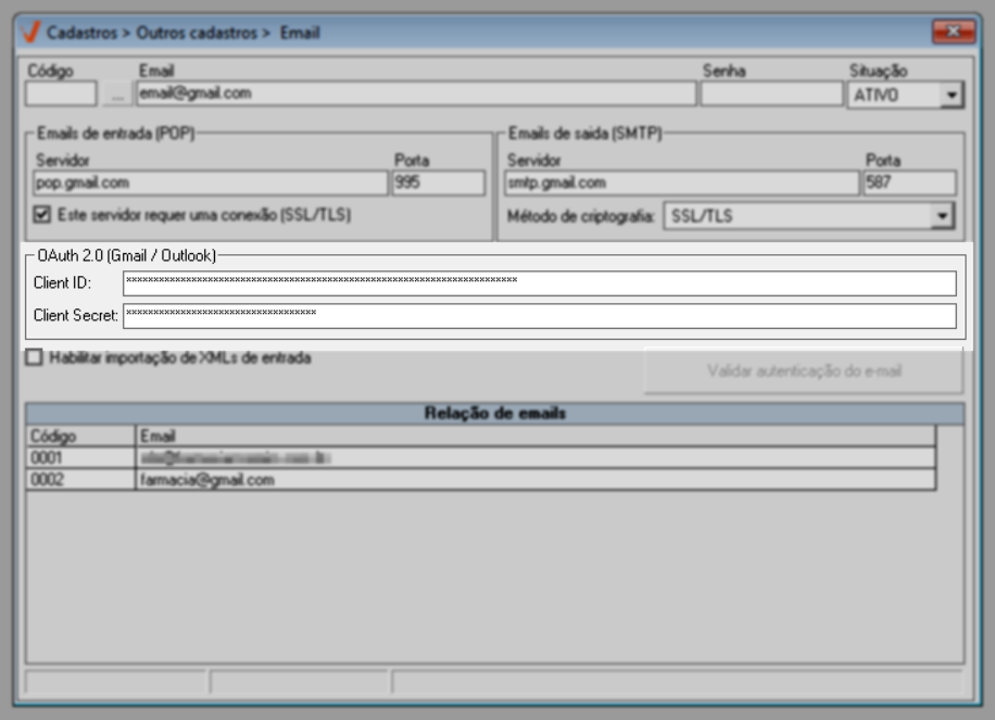 Através da tela de cadastro de e-mails, o usuário realiza o cadastro e o gerenciamento dos endereços de e-mail que serão utilizados para o recebimento automático dos arquivos XML enviados à loja. Para e-mails hospedados nos provedores Gmail ou Outlook, é obrigatória a realização prévia da configuração de autenticação OAuth 2.0, com a obtenção das credenciais Client ID e Client Secret, conforme mencionado nos pré-requisitos gerais dessa operação. Somente após essa configuração adicional o e-mail poderá ser cadastrado corretamente no sistema. Por outro lado, os usuários cujos e-mails estejam hospedados em outros provedores, como o Yahoo por exemplo, não precisam realizar essa configuração adicional. Nesses casos, basta ter em mãos o endereço de e-mail e a senha de acesso correspondentes para concluir o cadastro.