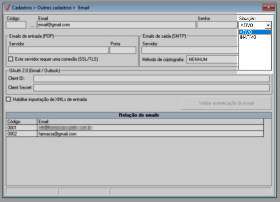 Na sequência, no campo "Situação", selecione o status do novo cadastro. Ao escolher a opção "Ativo", após a finalização do cadastro, a configuração do e-mail ficará funcional e o sistema passará a realizar automaticamente a busca pelos arquivos XML. Já a opção "Inativo" indica que o cadastro permanecerá desativado, não efetuando a busca dos arquivos. Essa alternativa permite que o e-mail seja ativado posteriormente, quando necessário.