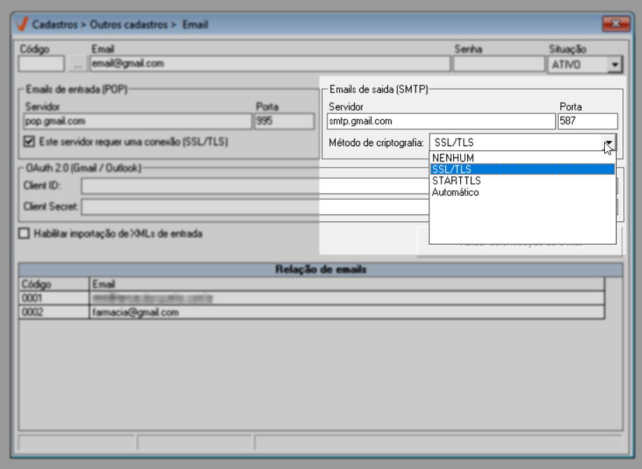 Para e-mails hospedados nos provedores Gmail e Outlook, o “Método de criptografia” é SSL/TLS" deve ser configurado como "SSL/TLS", conforme a exigência de conexão definida nas opções ao lado. Para e-mails hospedados em outros provedores, o “Método de criptografia” deverá ser selecionado de acordo com as configurações exigidas pelo servidor, sendo recomendada a consulta à documentação oficial do serviço de e-mail para garantir a correta seleção.