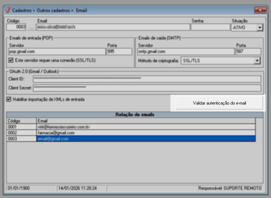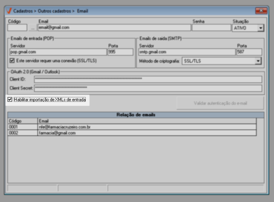 Após cadastrar um novo e-mail, o usuário deverá realizar a validação da autenticação para que, por meio do OAuth 2.0, sejam concedidas ao sistema as permissões necessárias de acesso à conta de e-mail. Por esse motivo, é fundamental que o cadastro tenha sido preenchido corretamente. Caso alguma informação esteja incorreta ou incompleta, a comunicação com o provedor de e-mail não será estabelecida de forma adequada e, consequentemente, a verificação e importação dos arquivos XML não ocorrerá corretamente. Sendo assim, ao acessar o cadastro do e-mail para validação, é recomendável verificar se todas as informações informadas estão corretas e, se necessário, atualizar os dados ou até mesmo excluir o registro. Confira a seguir os detalhes a seguir.