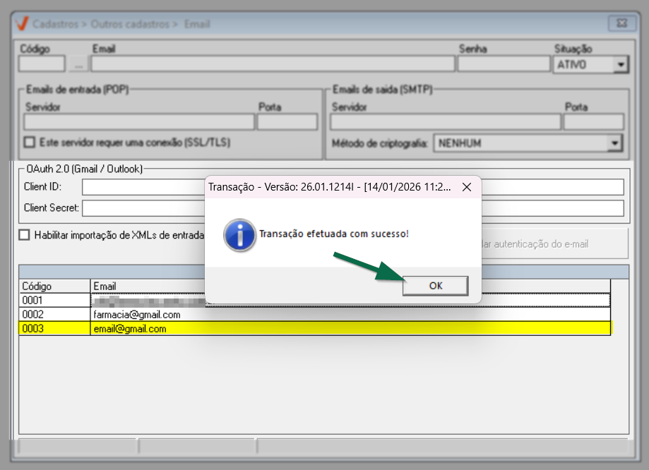 Logo após, o sistema gravará a informação gerando um código de cadastro para o novo registro, e ao final exibirá a mensagem: "Transação efetuada com sucesso!". O novo registro será incluído na "Relação de e-mails" na seção abaixo, clique em >> Ok para confirmar a leitura da mensagem.