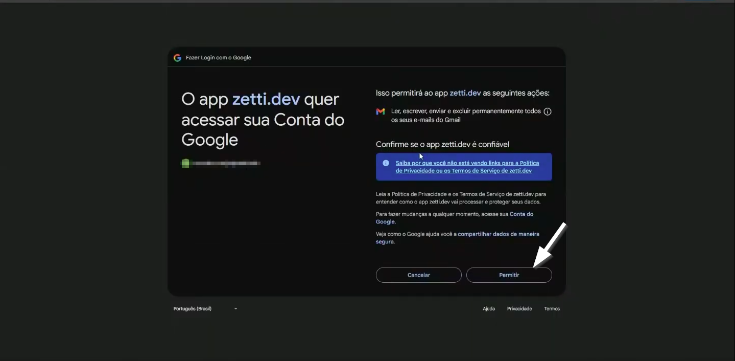 Para e-mails hospedados nos provedores Google e Microsoft , ao realizar a validação, o sistema abrirá uma nova guia do navegador com a tela de login do respectivo provedor. Após efetuar o login normalmente, será exibida uma tela informando que a aplicação app zetti.dev solicita permissão para acessar a conta de e-mail. Para concluir o processo de autenticação e permitir a comunicação com o sistema, clique em >> Permitir.