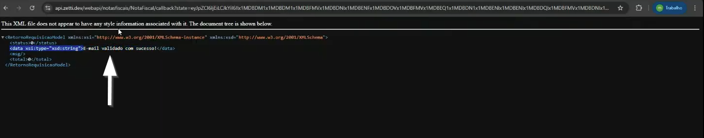 Após, caso a validação seja concluída com sucesso, a página será atualizada com o retorno da validação, conforme o exemplo abaixo, exibindo a mensagem “E-mail validado com sucesso”. Observe que, o link exibido contém a URL de redirecionamento utilizada no cadastro (https://api.zetti.dev/webapi/notasfiscais/NotaFiscal/callback). Essa informação confirma que o processo de autenticação e validação foi realizado com sucesso.