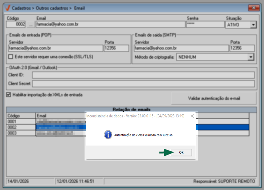 Quando o e-mail consultado pertencer ao provedor KingHost, Yahoo, Uol, Bol, GloboMail, iCloud ou outro que não seja Google e Microsoft, e as informações de cadastro estiverem preenchidas corretamente, o sistema exibirá a mensagem “Autenticação do e-mail validada com sucesso”. Clique em >> OK para confirmar a leitura e concluir a validação.