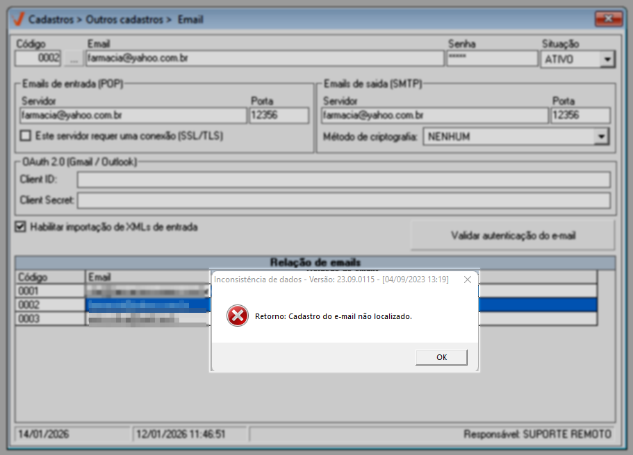 Se houver alguma divergência no cadastro do e-mail, será exibido um alerta de inconsistência de dados, sendo necessária a correção das informações. Neste caso, clique em >> Ok para confirmar a leitura da mensagem, realize os ajustes necessários e repita o processo de validação.