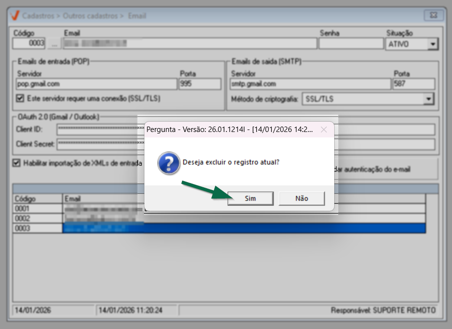Ao confirmar, outra mensagem será exibida, informando sobre o sucesso da operação e o registro será removido da seção "Relação de e-mails".