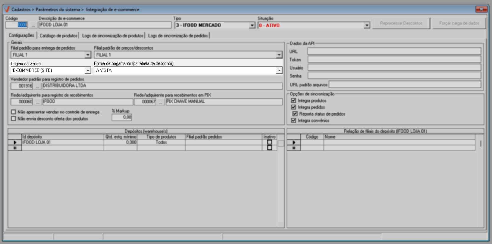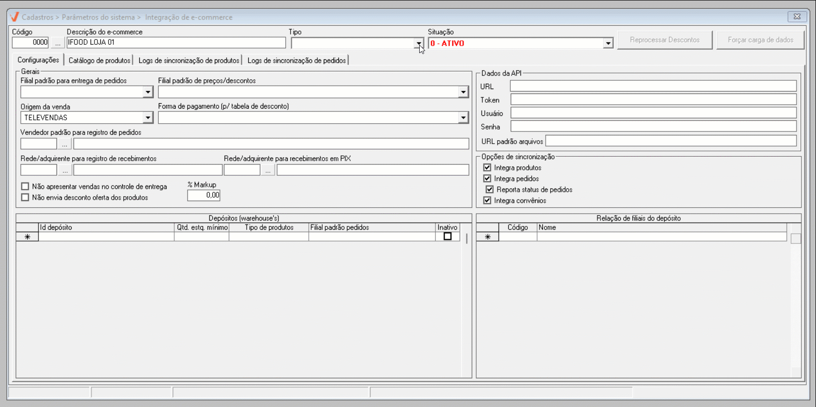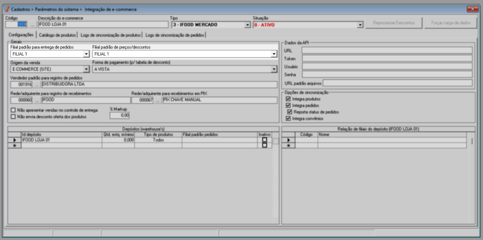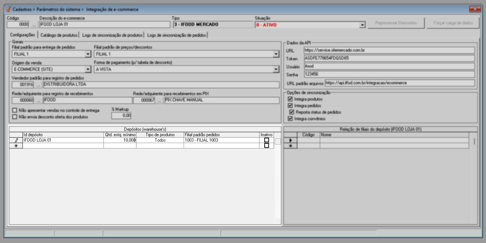 A integração é realizada por loja, ou seja, as configurações devem ser realizadas para cada filial que irá utilizar o serviço de e-commerce.