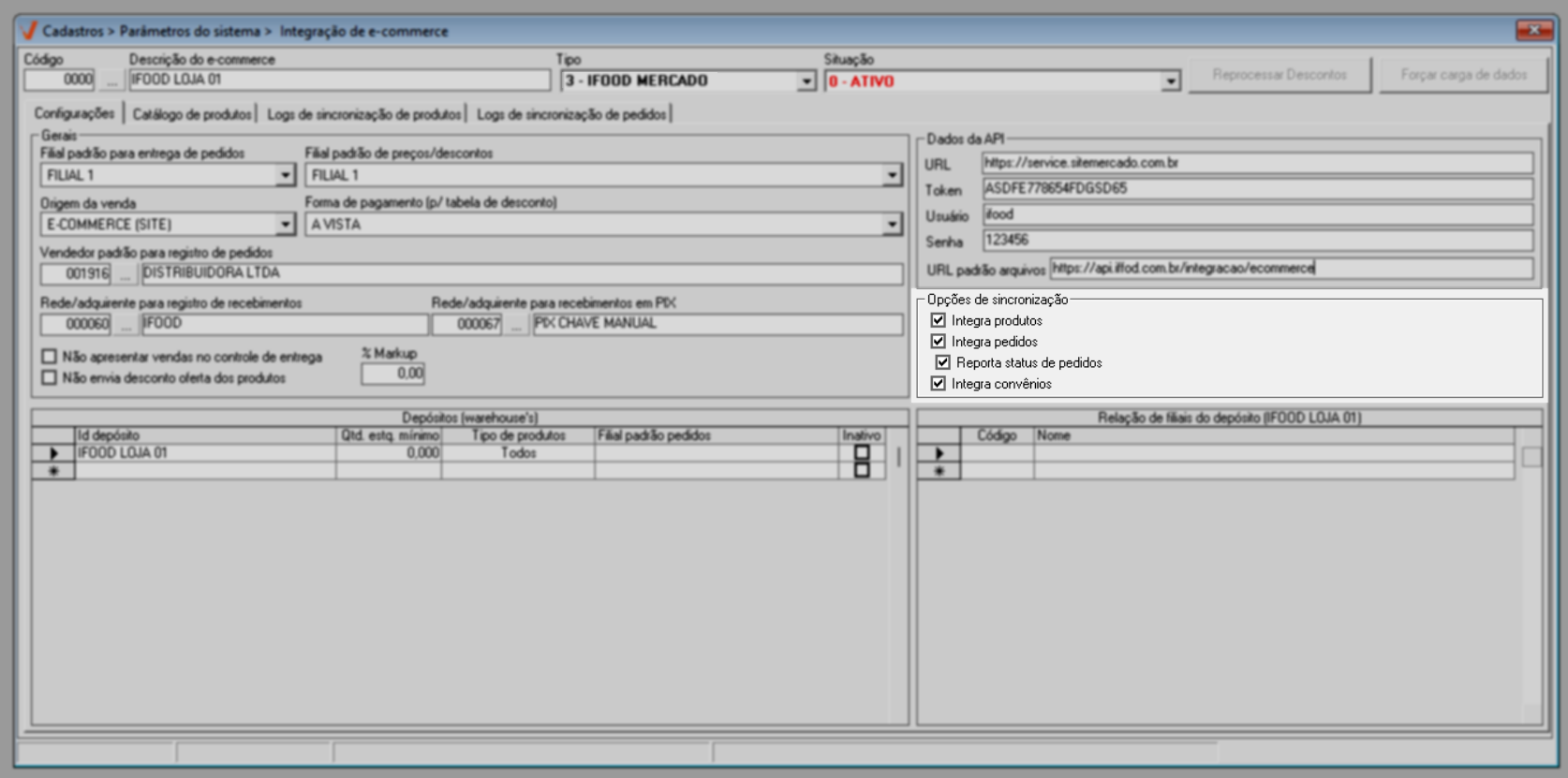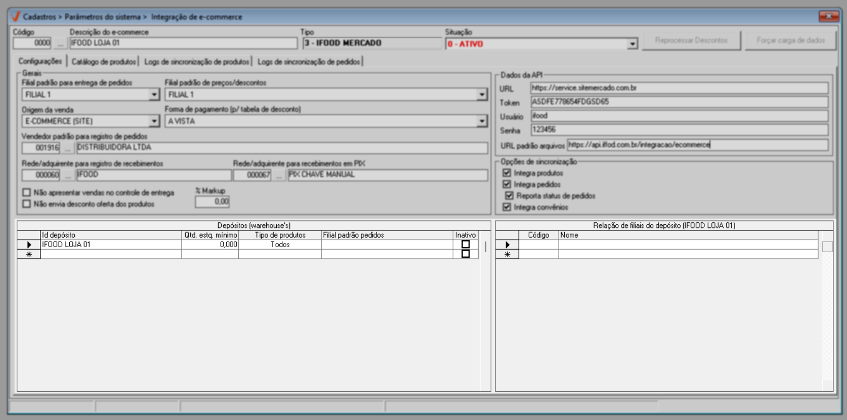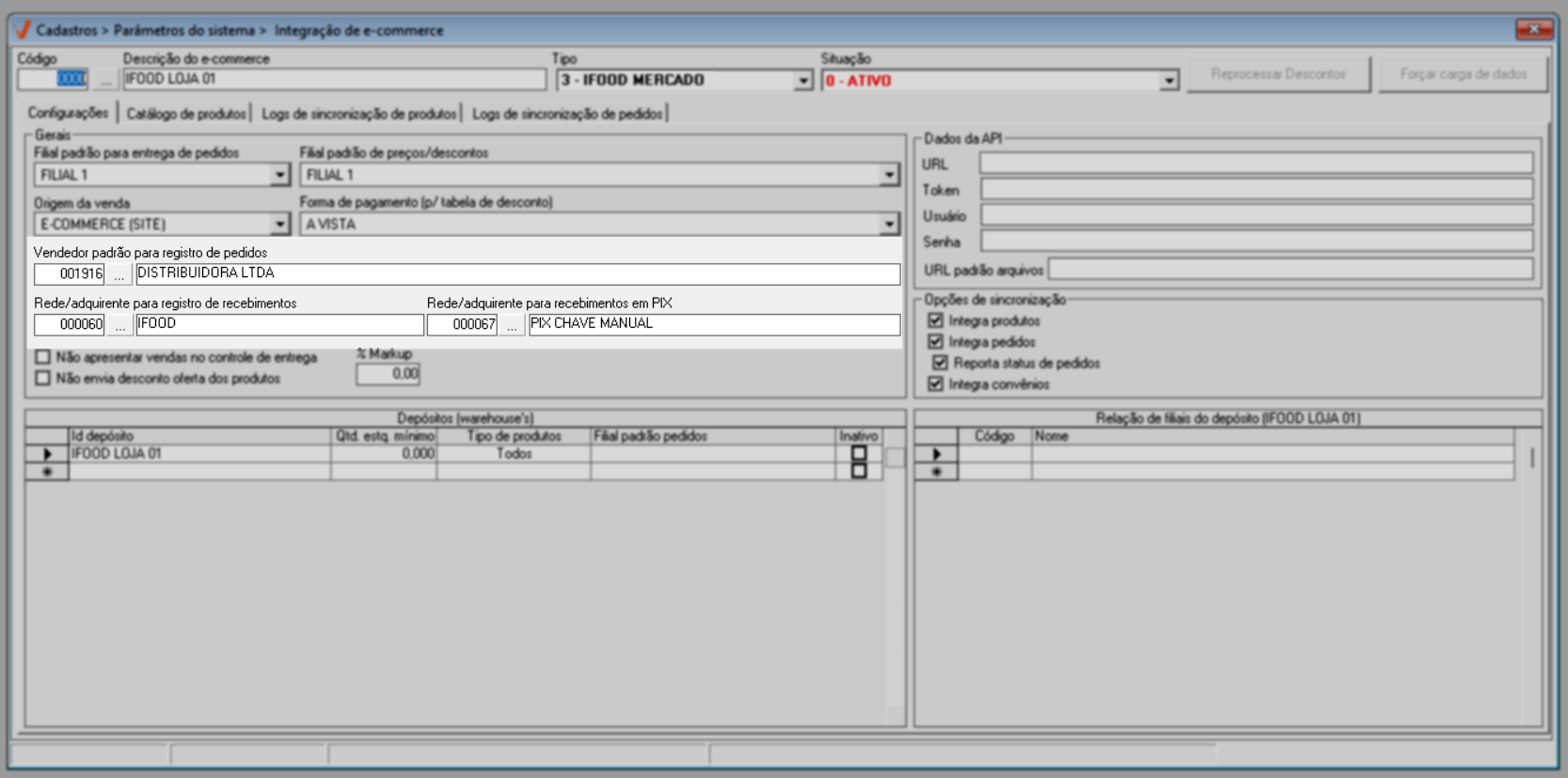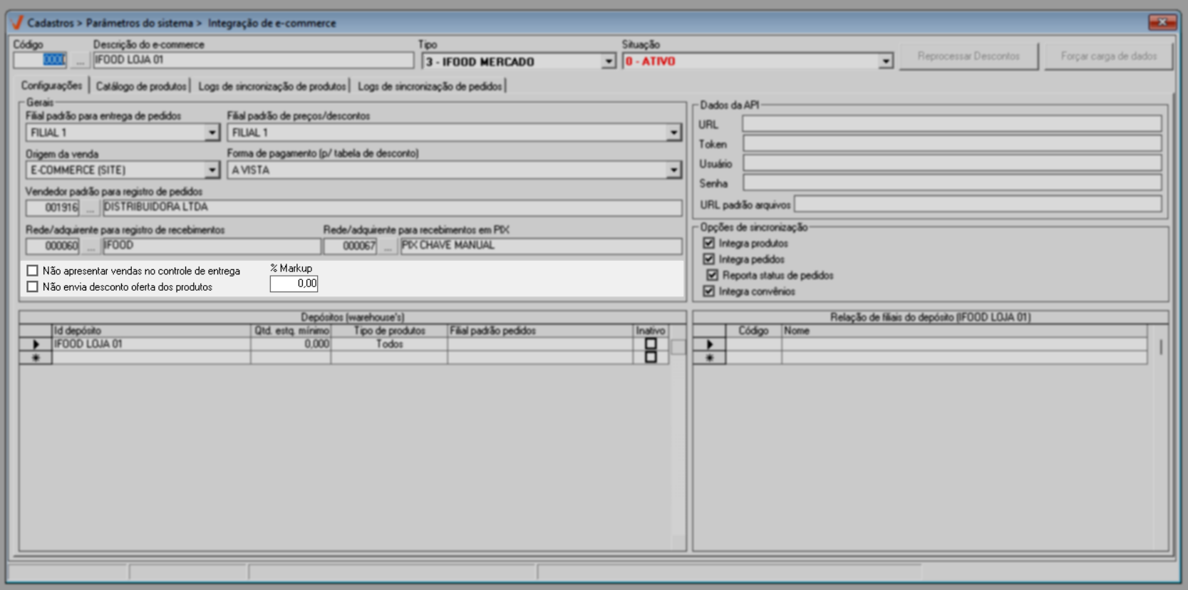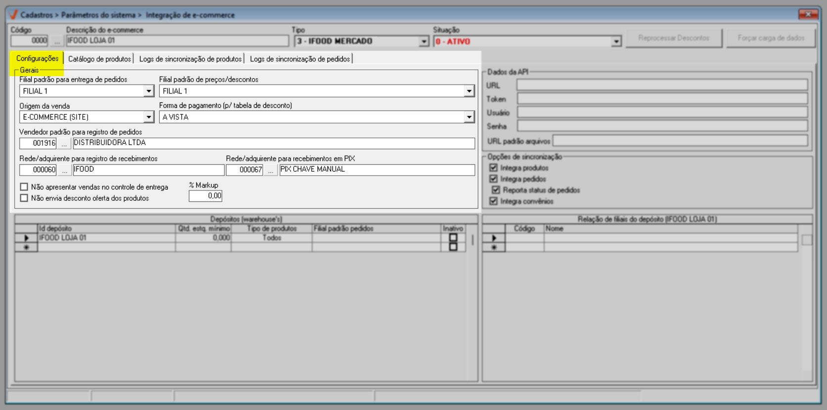A integração é realizada por loja, ou seja, as configurações devem ser realizadas para cada filial que irá utilizar o serviço de e-commerce.