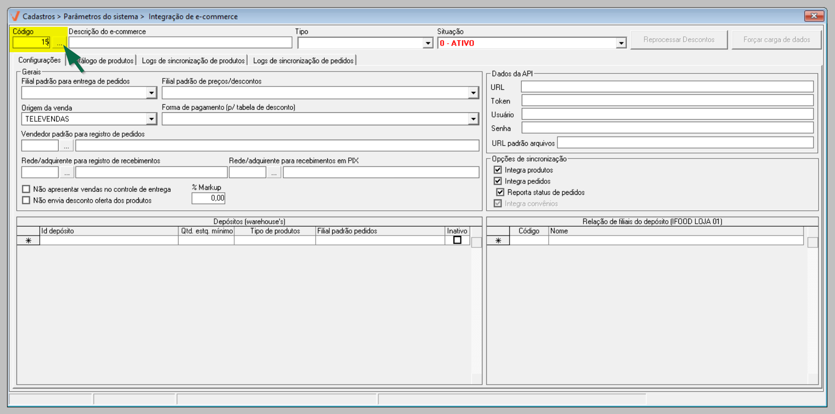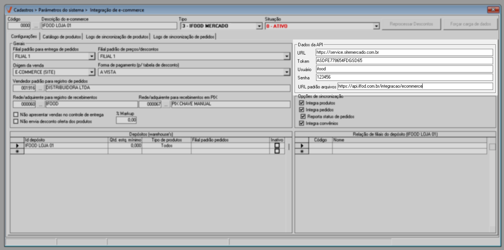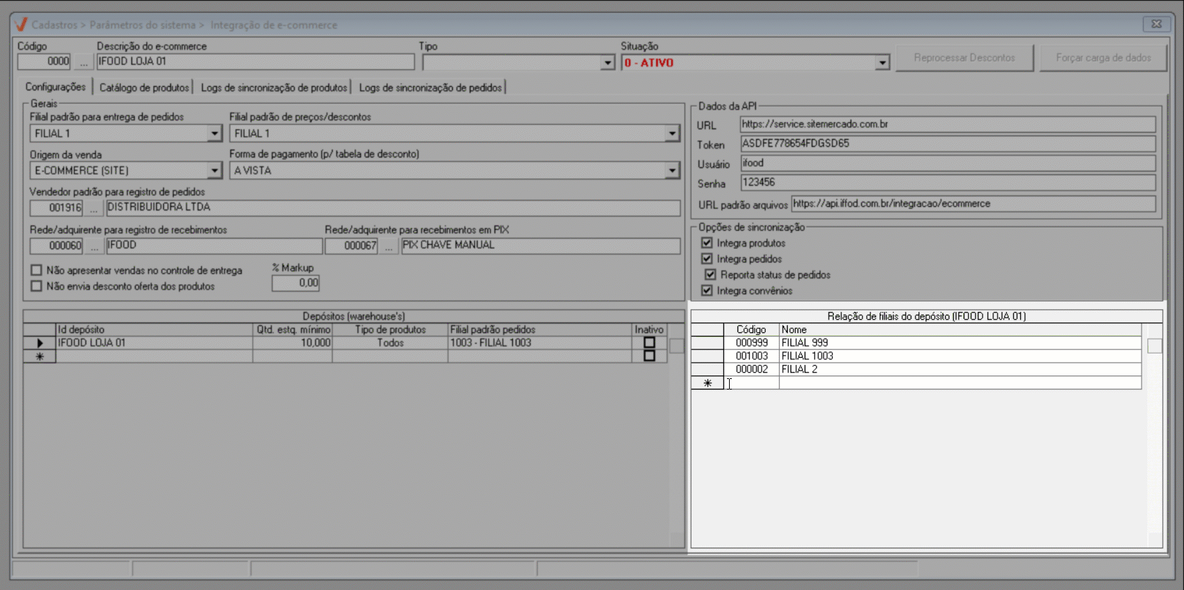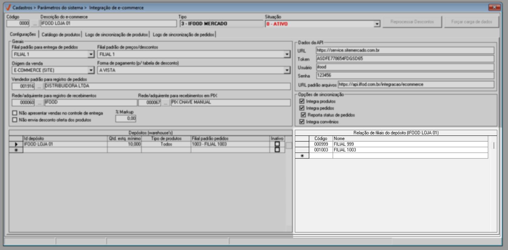 A integração é realizada por loja, ou seja, as configurações devem ser realizadas para cada filial que irá utilizar o serviço de e-commerce.