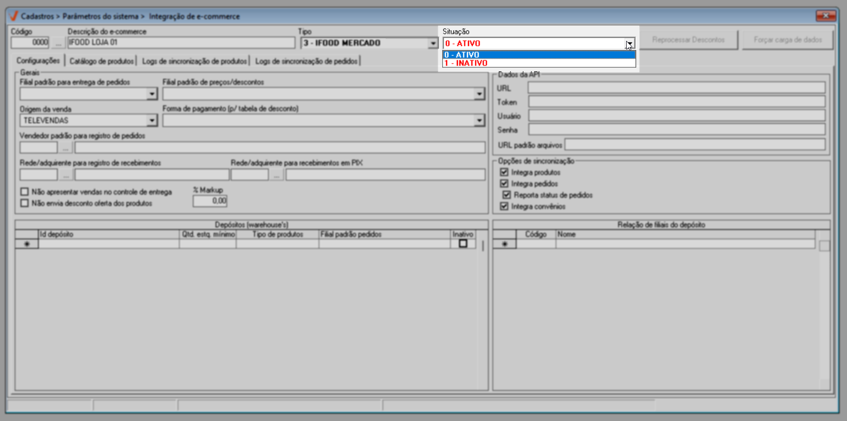 Após selecionar o tipo de integração, especifique a "Situação" do cadastro escolhendo entre ativo ou inativo: