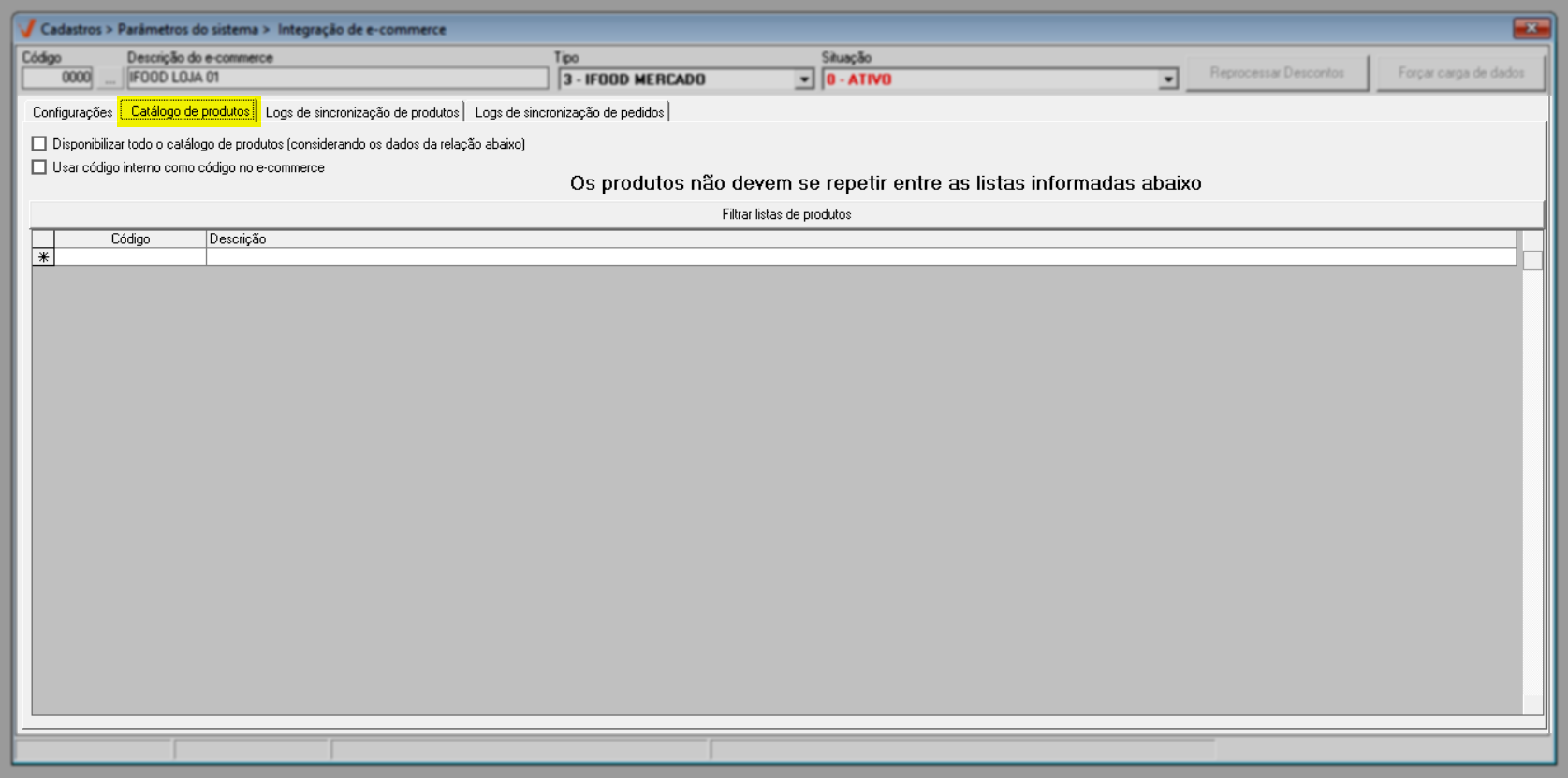 Após concluir as configurações anteriores, o próximo passo é incluir os produtos que a empresa irá disponibilizar no e-commerce. Para isso, acesse a aba “Catálogo de produtos” e realize o vínculo dos itens que farão parte da integração.