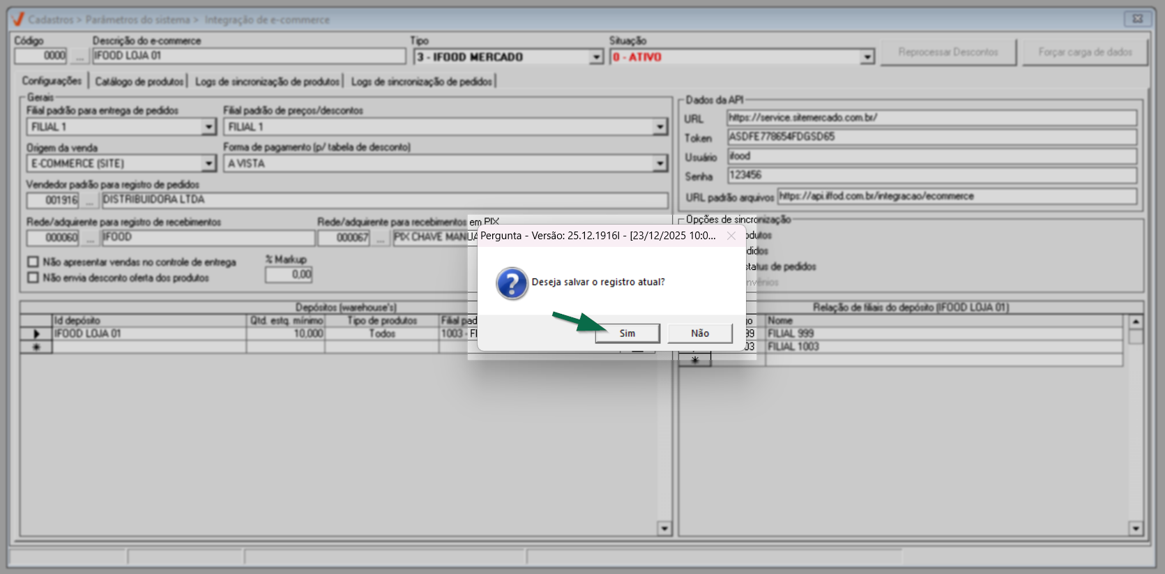 Após concluir as definições, finalize o cadastro pressionando o atalho >> F2. Em seguida, confirme a mensagem “Deseja salvar o registro atual?”. Após a confirmação, o sistema realizará o salvamento e a tela será limpa automaticamente, ficando pronta para o cadastro de uma nova integração.