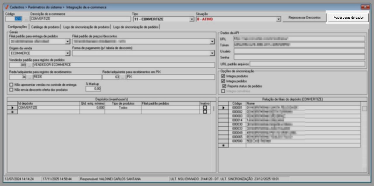 A opção "Forçar carga de dados", quando habilitada, possibilita ao usuário exigir que o sistema envie novamente ao e-commerce todos os produtos, independentemente de terem sofrido alterações ou não. Essa funcionalidade é útil quando se identifica muitas divergências entre as informações armazenadas no sistema e aquelas presentes no e-commerce.