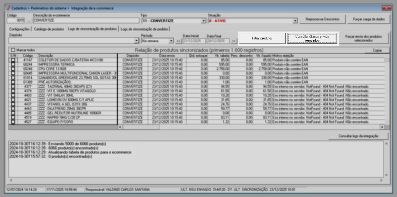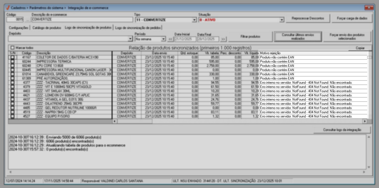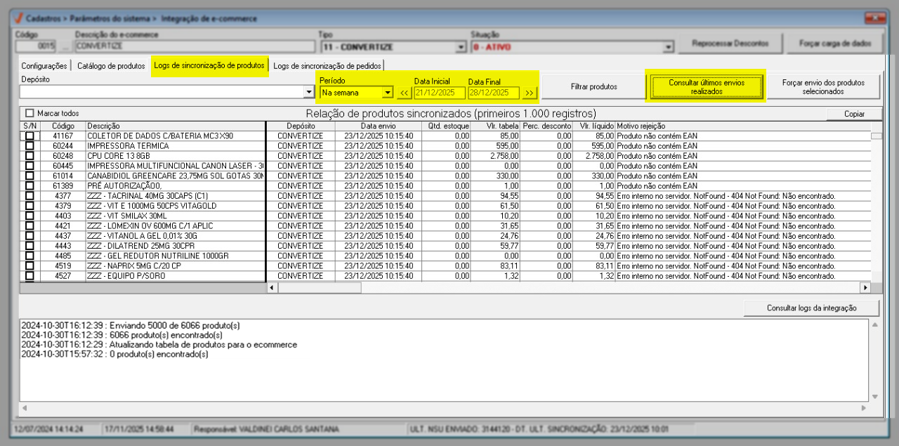 Logs de sincronização de produtos