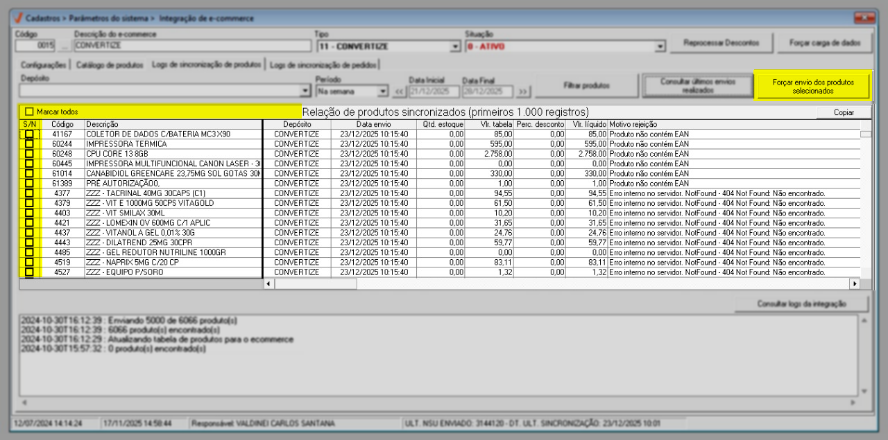 Por fim, o usuário poderá utilizar o botão >> "Forçar envio dos produtos selecionados" este recurso possibilita sincronizar os produtos listados na tela, permitindo que o usuário verifique eventuais advertências no momento que desejar. Para isso, basta marcar a caixa de seleção "S/N" correspondente aos produtos de interesse e clicar em "Forçar envio dos produtos selecionados".