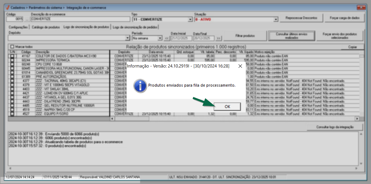 Após, será exibido um alerta com a seguinte mensagem: "Produtos enviados para fila de processamento". Clique em "Ok" para confirmar a leitura.