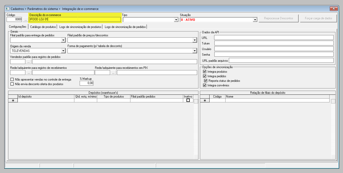 - 0 - Ativo: Indicará que este E-commerce estará ativo na loja;