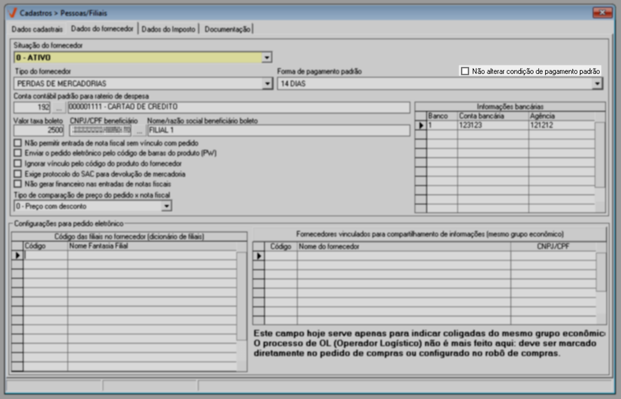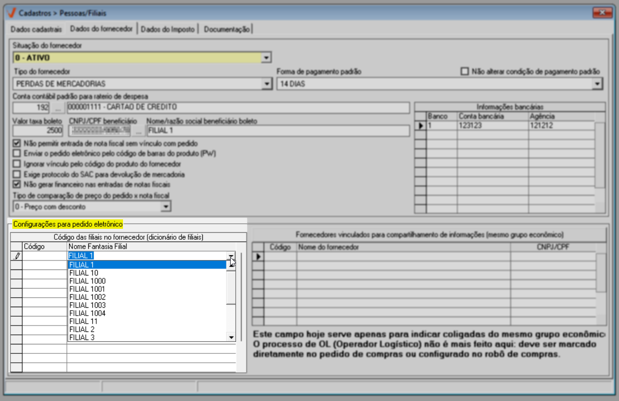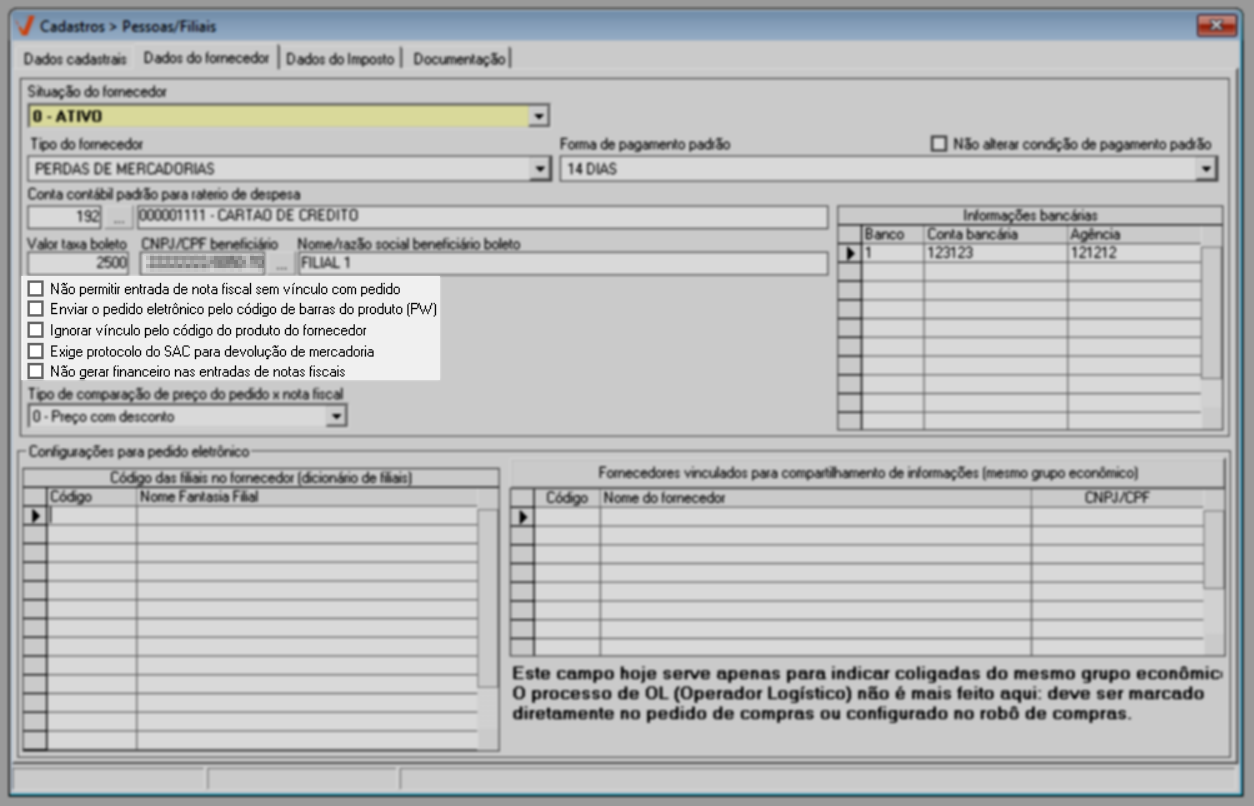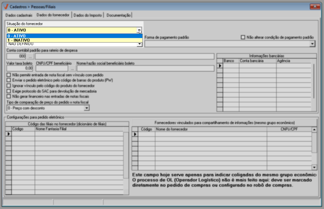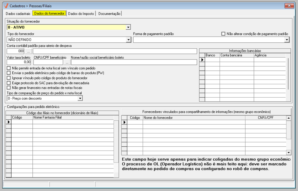 A seção "Fornecedores Vinculados para compartilhamento de pedidos", é destinada para permitir que fornecedores compartilhassem pedidos de compras entre si. Nessas operações, a compra é formalizada diretamente com a indústria, e a entrega pode ser realizada por distribuidores vinculados para aquela operação. Com isso, a função da seção é apenas indicar a qual grupo econômico o fornecedor pertence, servindo como referência para o correto relacionamento entre eles. Atualmente, a configuração de Operador Logístico (OL) é feita diretamente no Pedido de Compras ou no Robô de Compras, marcando a operação no momento da criação.