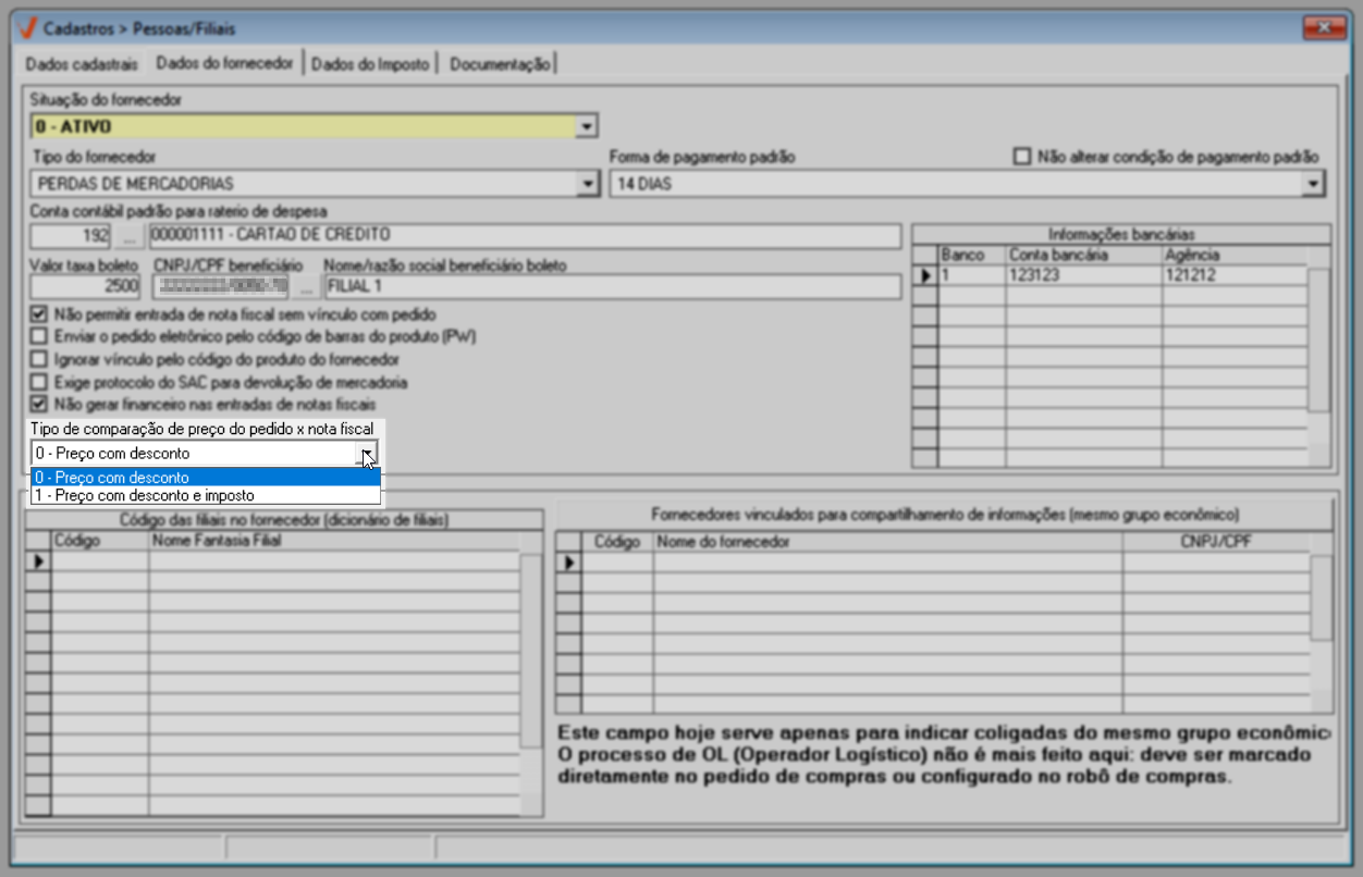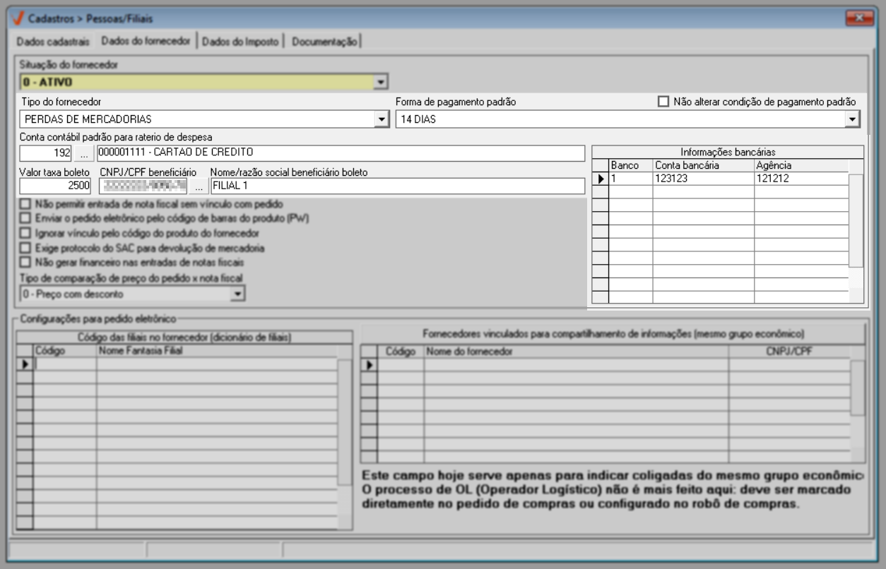 O tipo de fornecedor pode ser combinado, isto é, um fornecedor pode ser também um cliente, emitente de cheque e funcionário.