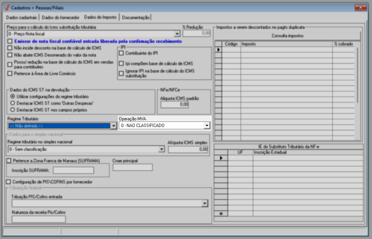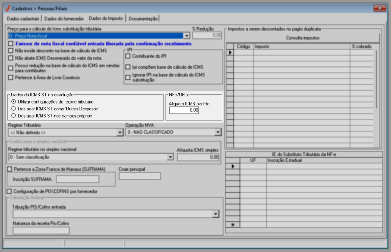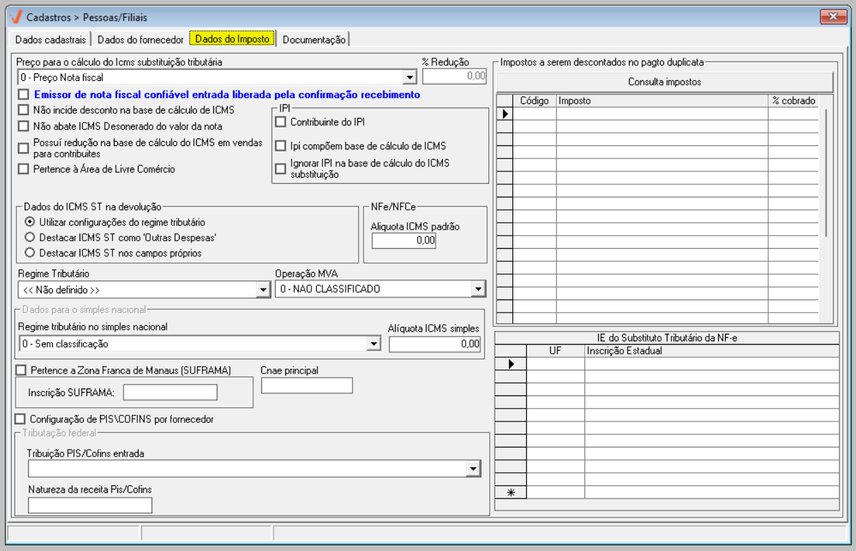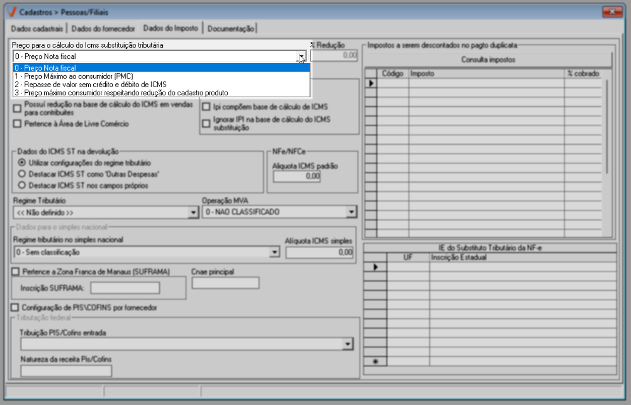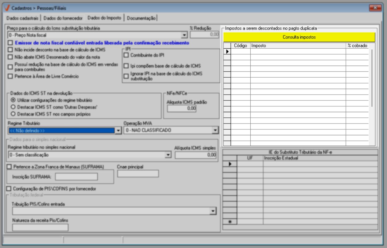 Conforme a necessidade, em "Impostos a serem desconsiderados no pagamento de duplicata" informe seguido de >> Enter o código do imposto e o percentual que será levado em consideração para a retenção de impostos lançados, isto é, ao realizar o lançamento de um documento a pagar para o fornecedor com esta configuração, o percentual informado será deduzido do valor total.