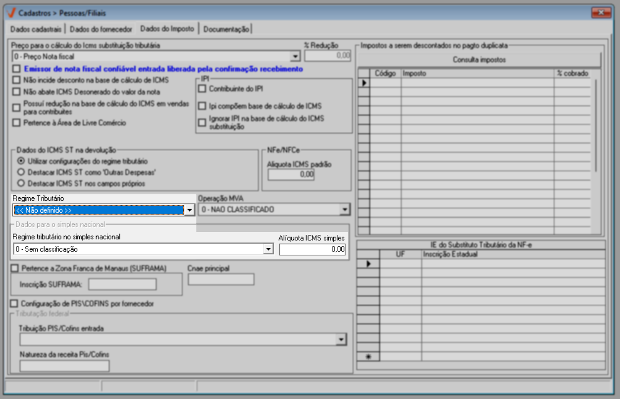 Em tipo de "Regime tributário", selecione o tipo de regime do fornecedor, e a seguir conforme o regime preencha os campos abaixo: