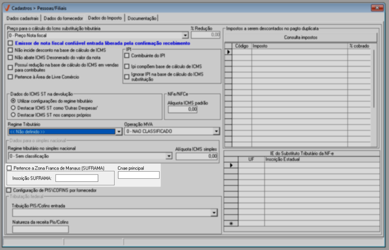 E quando o fornecedor pertencer à Zona Franca de Manaus, marque o campo >> Pertence a zona franca de Manaus (Sufarma) e em seguida preencha a informação correspondente no campo >> Inscrição SUFRAMA.
