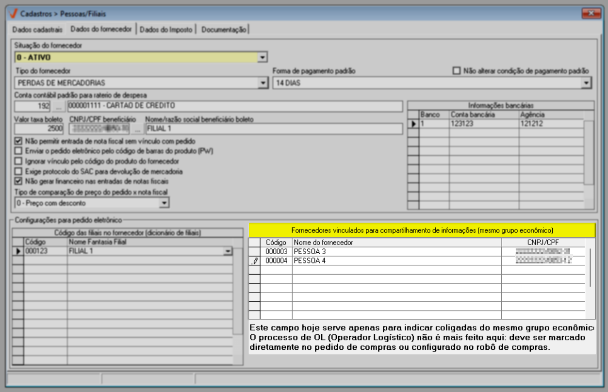 Por meio desta tela (Cadastro de Pessoas/Filiais), o usuário será capaz de cadastrar e monitorar o perfil de diversos tipos de usuários. Confira neste artigo como cadastrar e realizar a manutenção do cadastro do "Fornecedor" de produtos.
