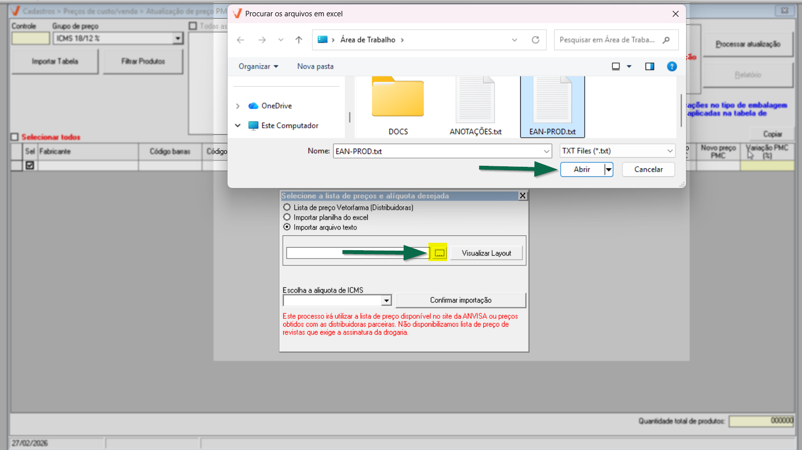 • Alíquota: Percentual aplicado sobre a base de cálculo de um imposto, utilizado para determinar o valor que deverá ser recolhido. No contexto da atualização de preços, corresponde ao percentual de ICMS vinculado à loja ou grupo de lojas.