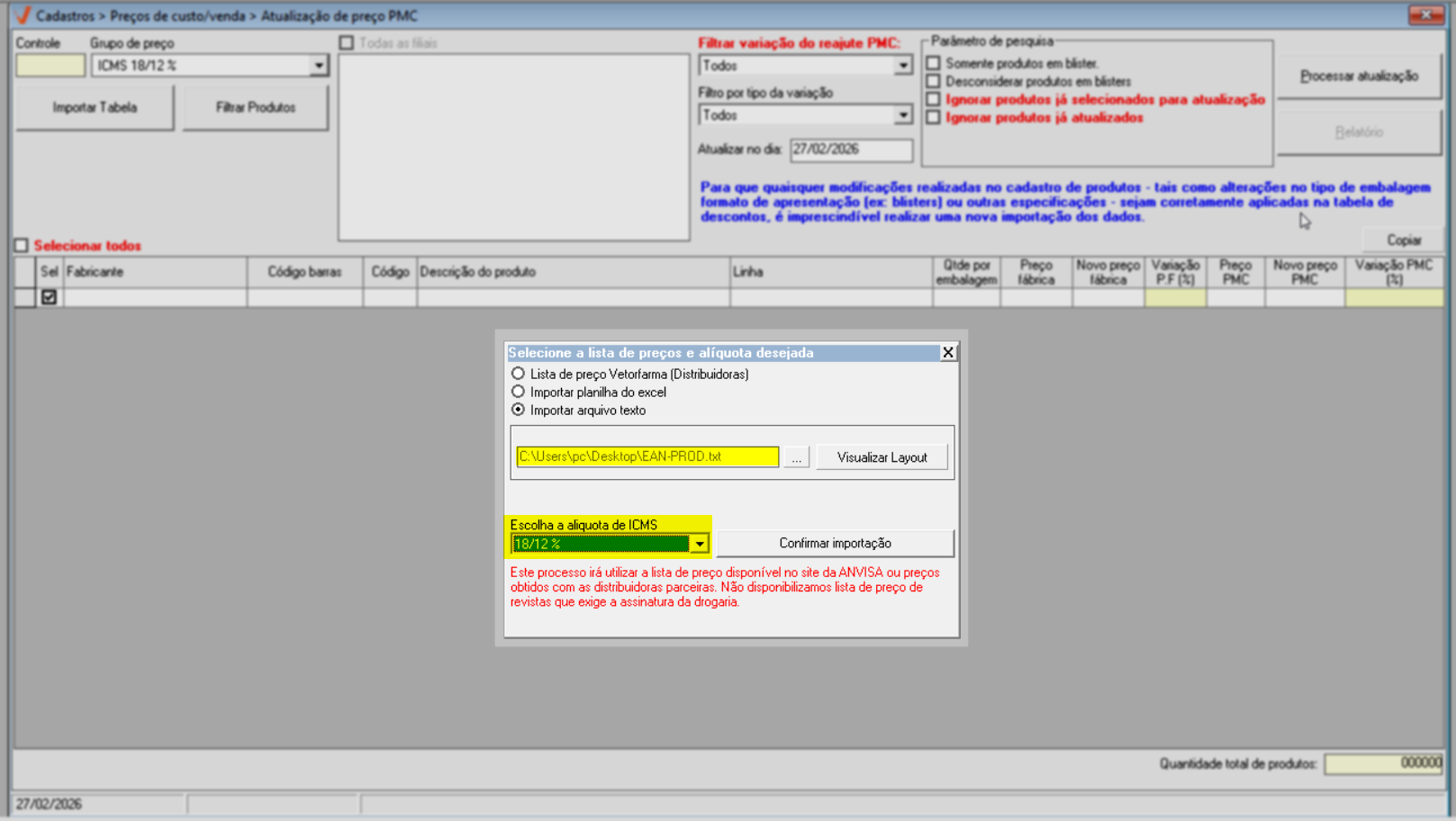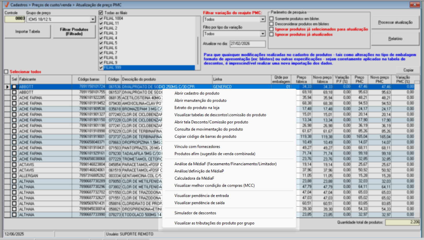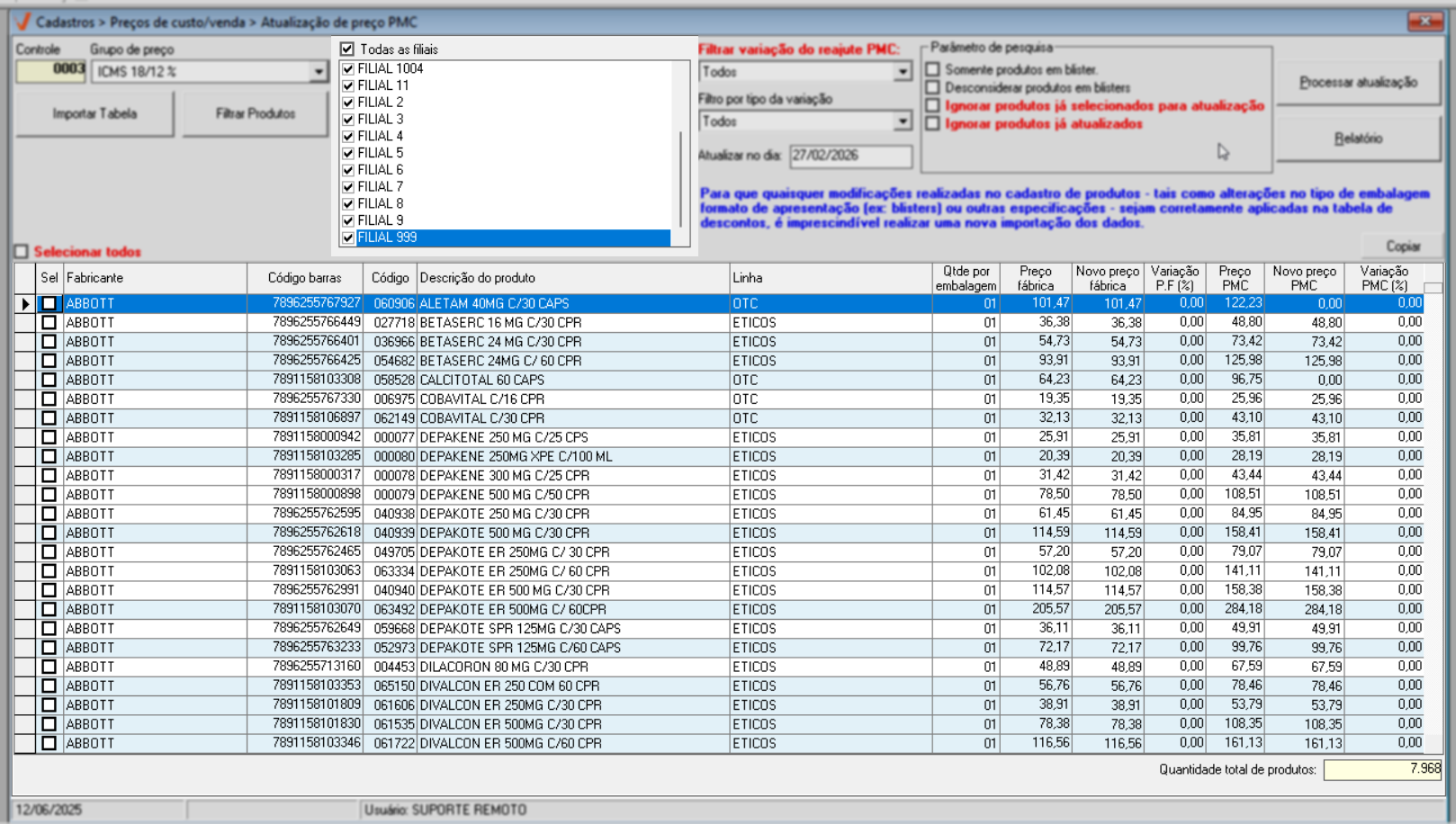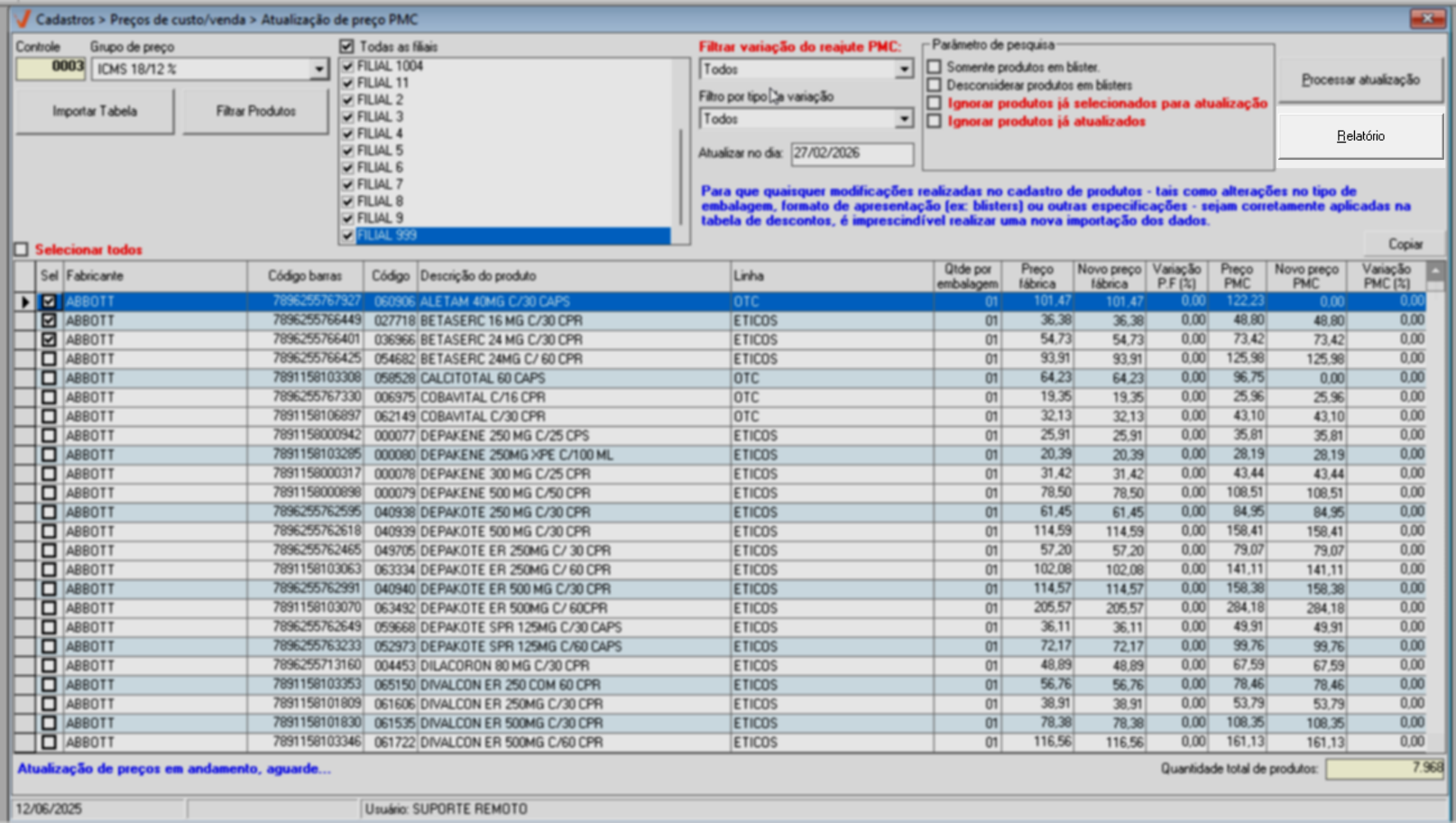 • PMC (Preço Máximo ao Consumidor): Valor máximo pelo qual determinado produto pode ser comercializado ao consumidor final, conforme regulamentação vigente. No sistema, refere-se ao preço que será atualizado conforme a tabela e os parâmetros definidos.