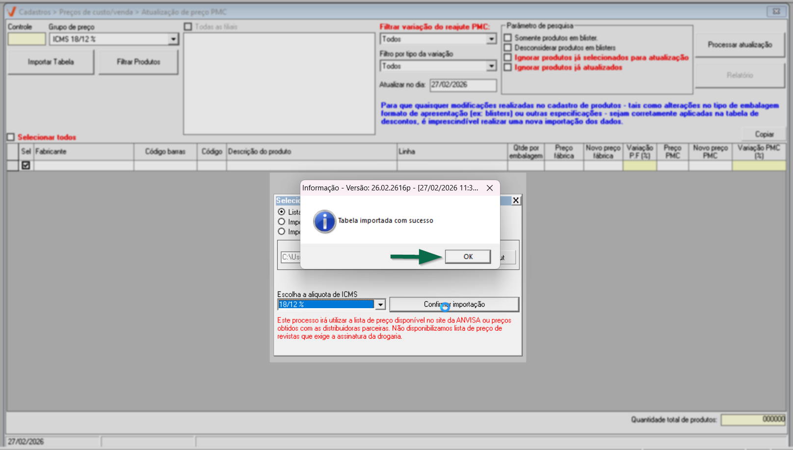 Por outro lado, se o percentual informado estiver disponível na lista de preços do Vetor Farma, o sistema exibirá uma mensagem informando que a tabela foi importada com sucesso. Basta clicar em >>Ok para confirmar a leitura da mensagem.