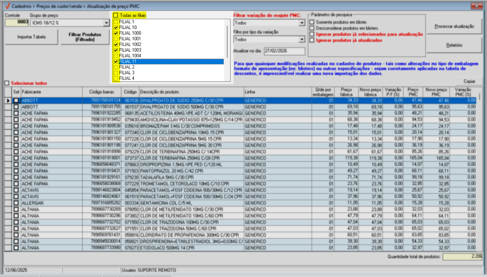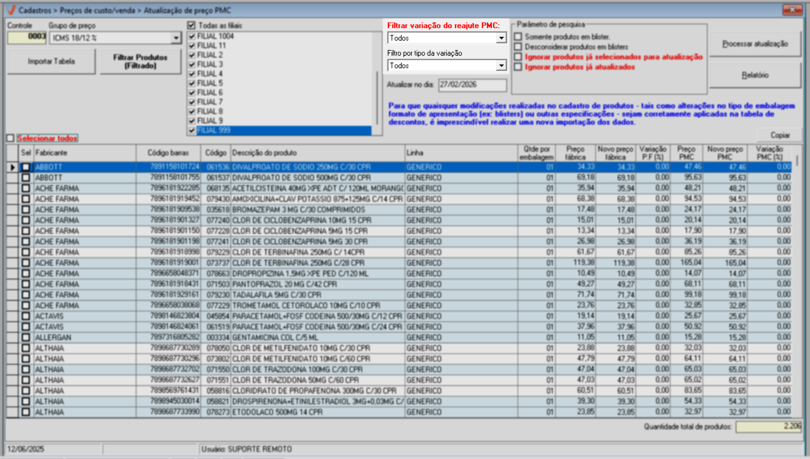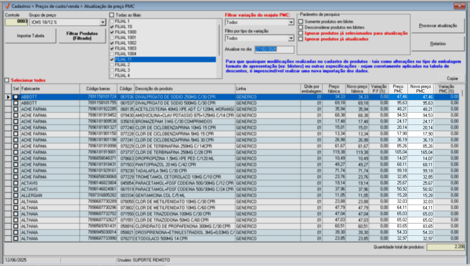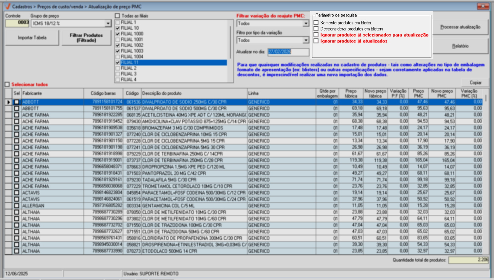 • Filtrar variação do reajuste PMC: Permite localizar os produtos conforme as variações do reajuste PMC aplicadas.