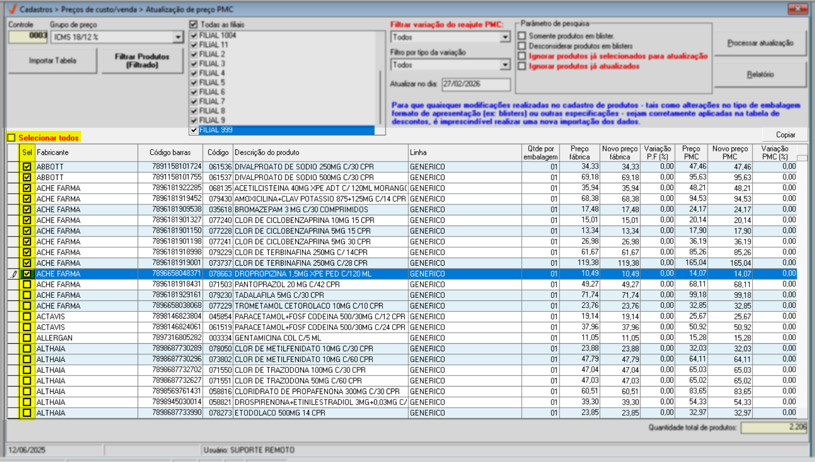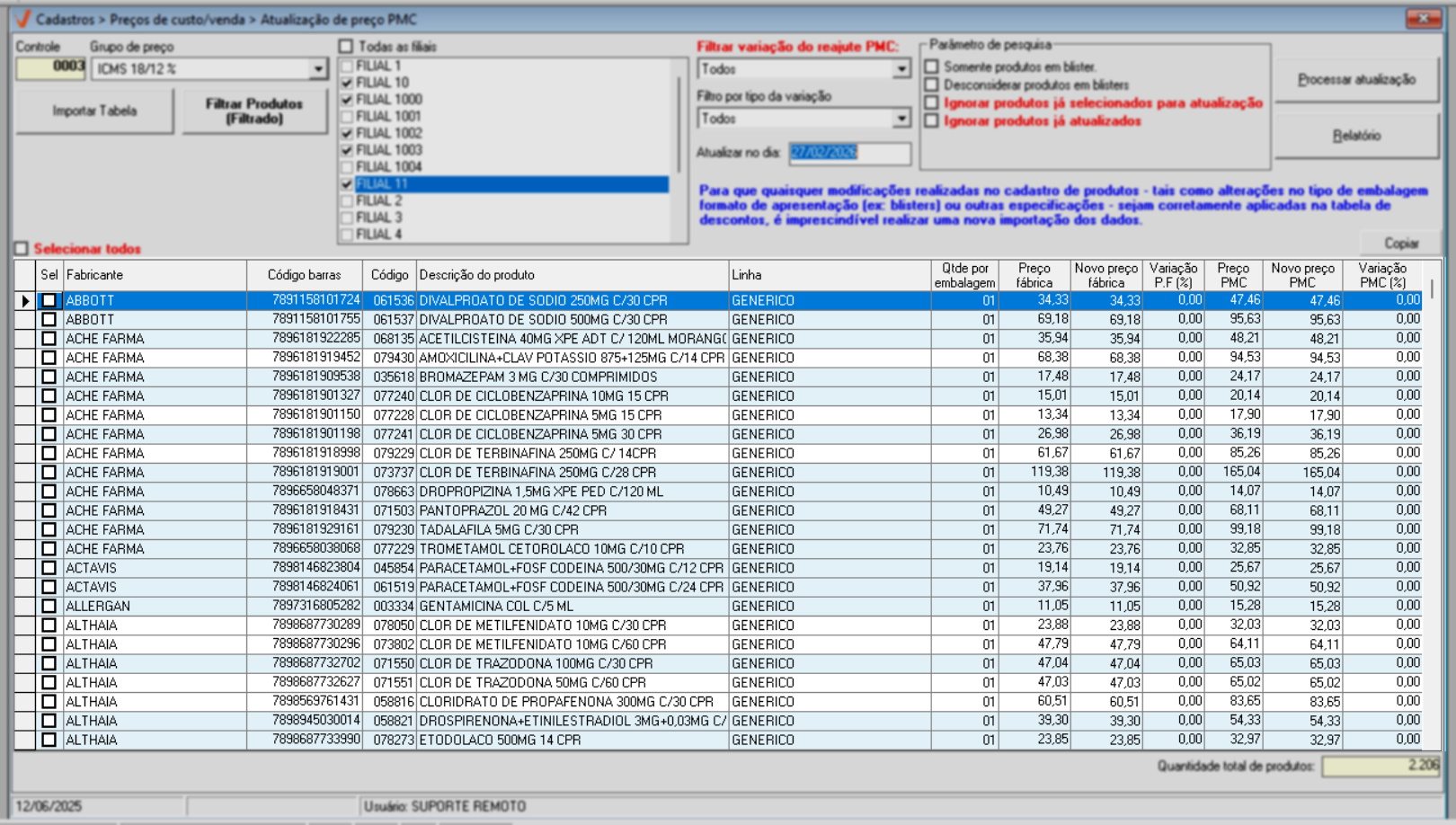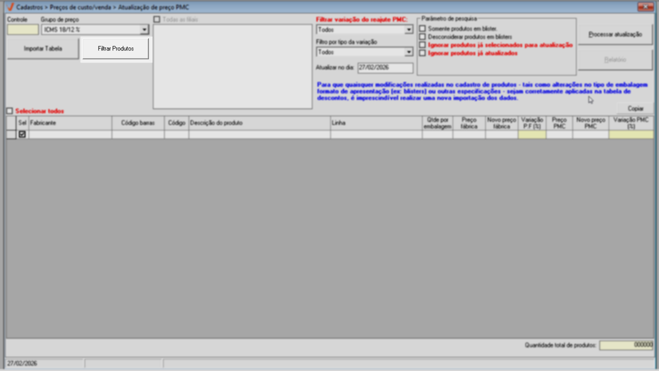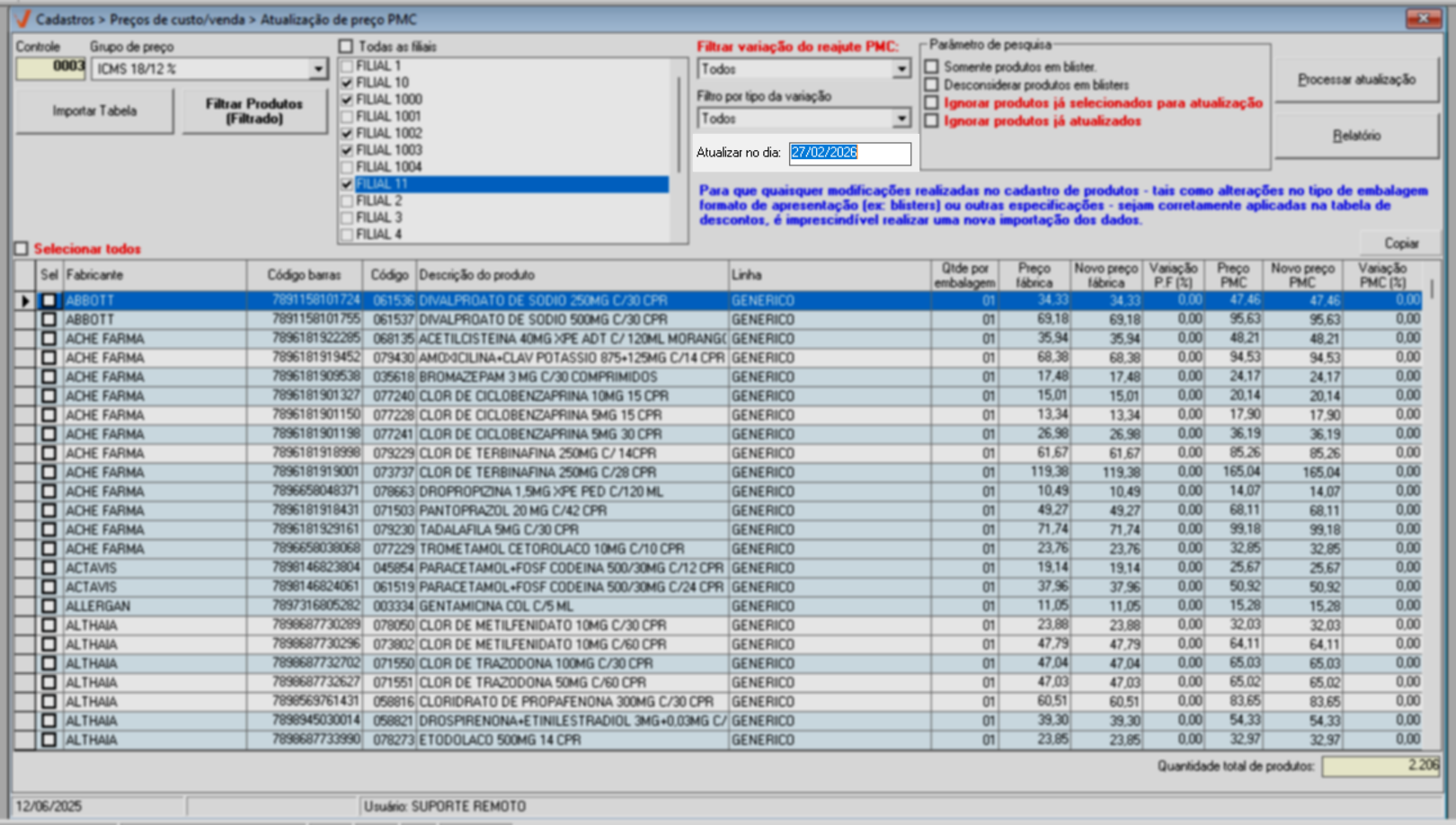 • Filtrar variação do reajuste PMC: Permite localizar os produtos conforme as variações do reajuste PMC aplicadas.
