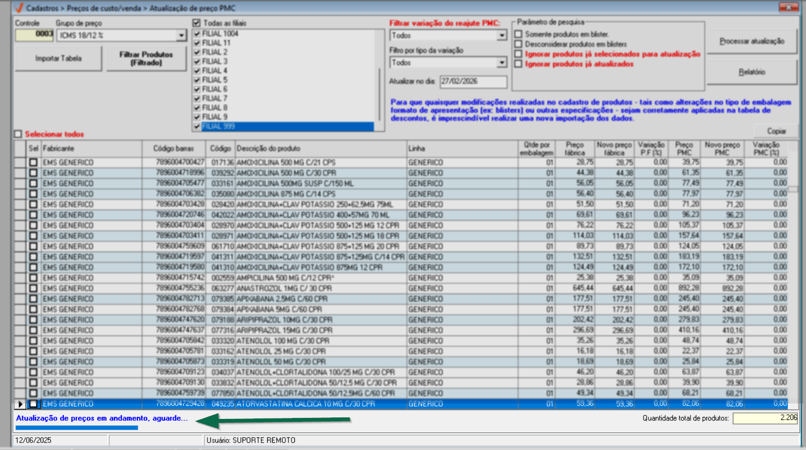 • Novo preço PMC: valor PMC que será aplicado após a atualização.