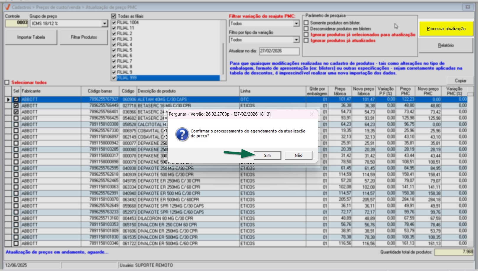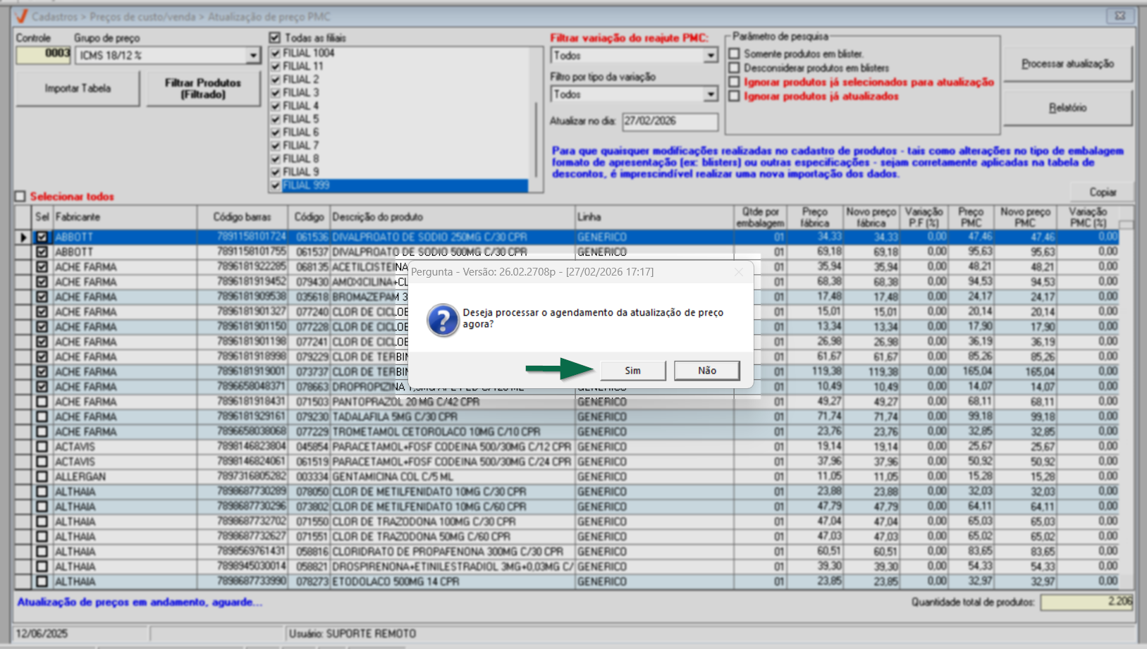 Caso clique em "Não", a atualização ficará pendente e poderá ser processada em outro momento. Neste cenário, o botão >> Processar atualização pode ser acionado a qualquer momento para executar todas as atualizações que estiverem pendentes no sistema. Ao acioná-lo, será apresentada a mensagem: “Deseja processar o agendamento da atualização de preço agora?”. Ao clicar em "Sim", todos os agendamentos pendentes que foram selecionados terão os preços PMC atualizados imediatamente.
