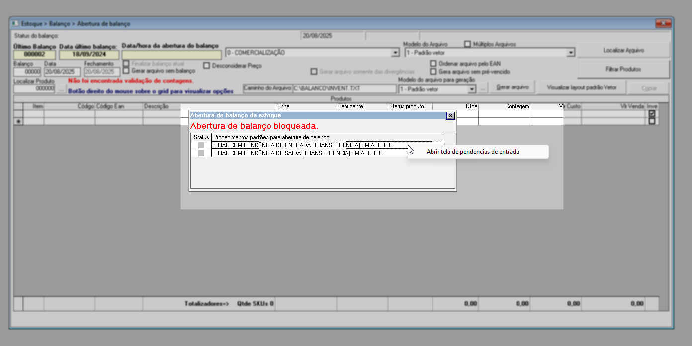 Ao acessar a tela, pode ser exibida uma janela informando sobre bloqueios específicos que impedem a abertura do balanço de estoque. Esses bloqueios têm a função de alertar o usuário sobre pendências que precisam ser verificadas e corrigidas, pois impactam diretamente na quantidade dos produtos registrados em estoque.
