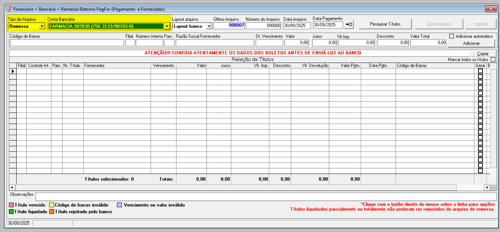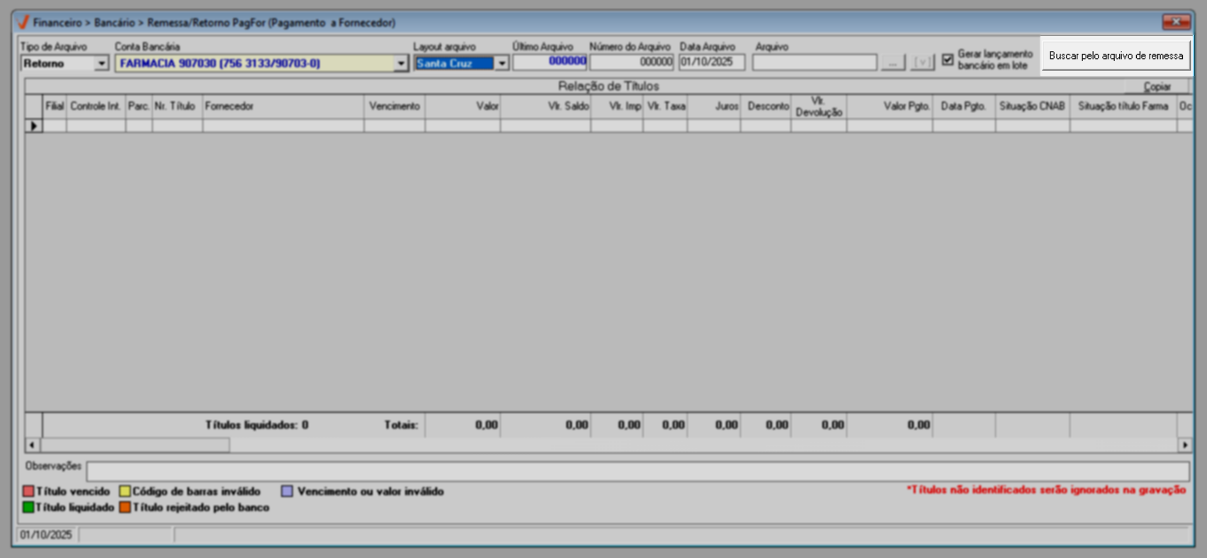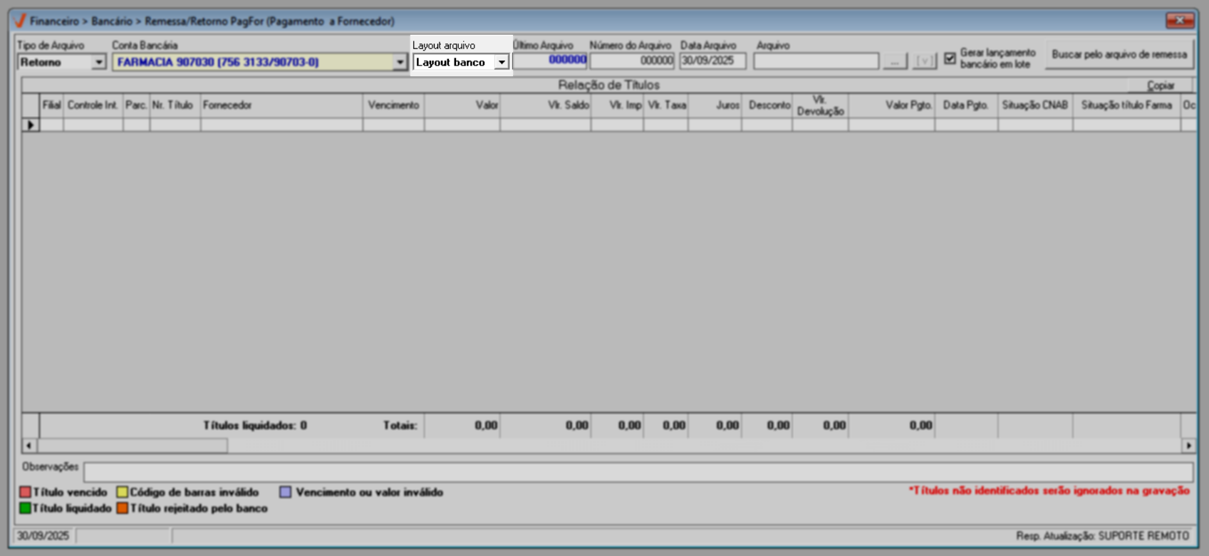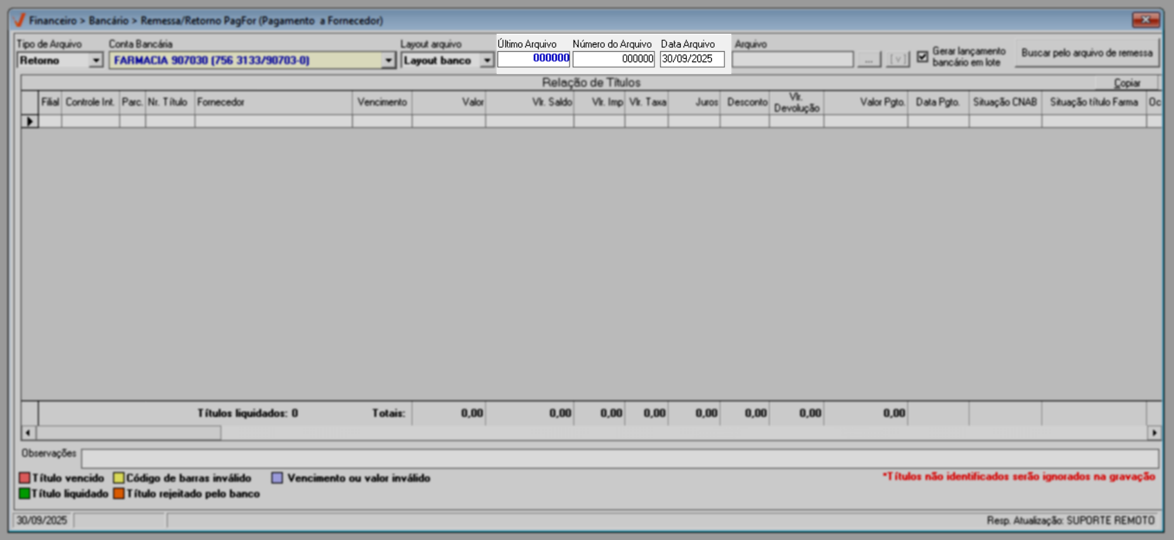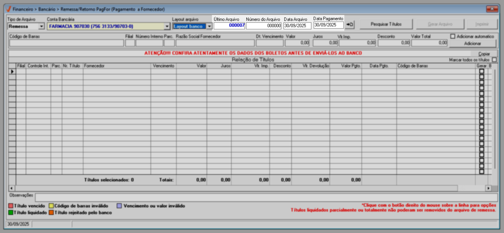 - Último arquivo: Este campo apenas mostrará a última remessa gravada, por exemplo: 000001, 000002, etc.