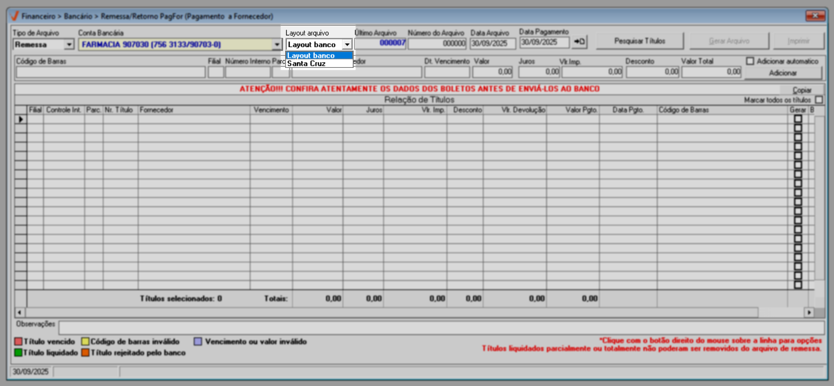 - Santa Cruz: Trata-se de um layout específico para pagamentos destinados à distribuidora Santa Cruz.