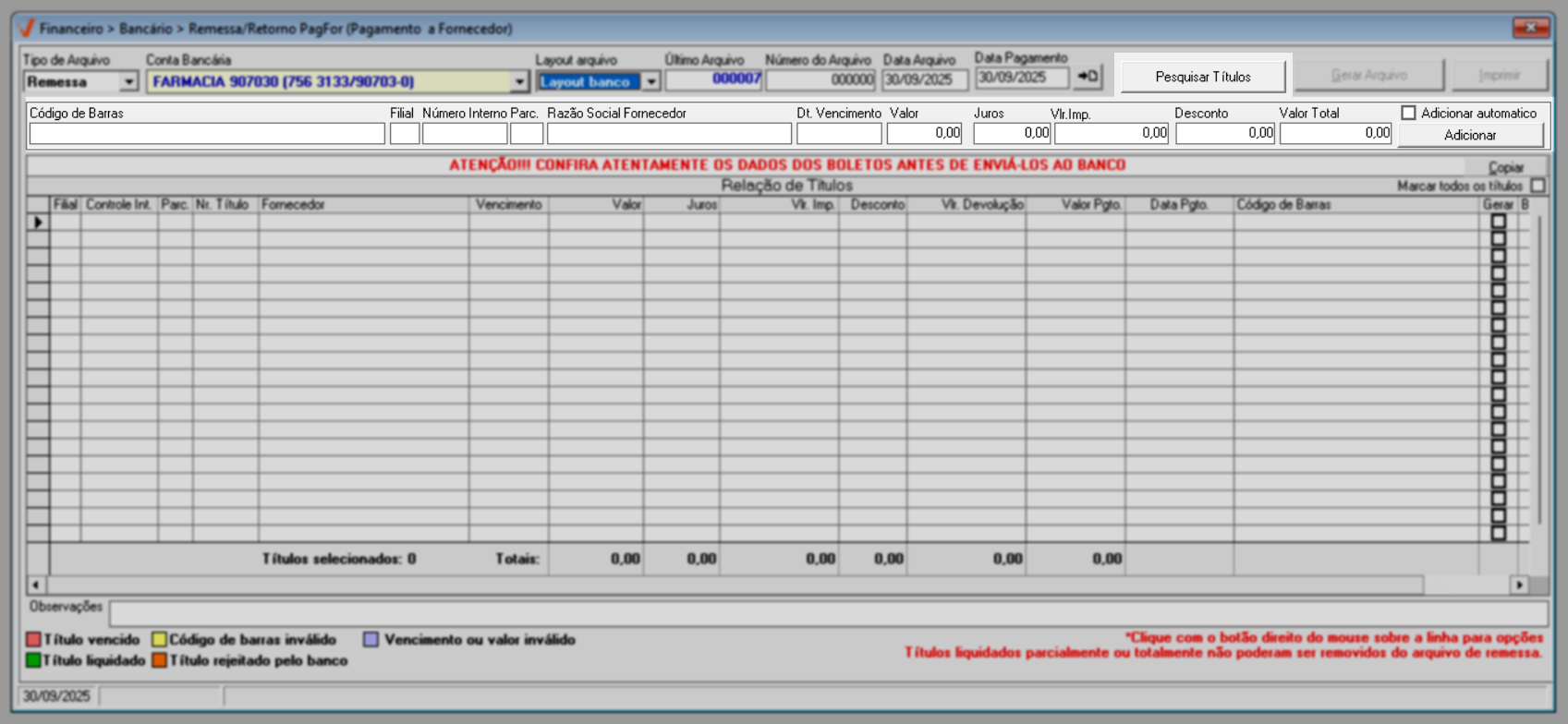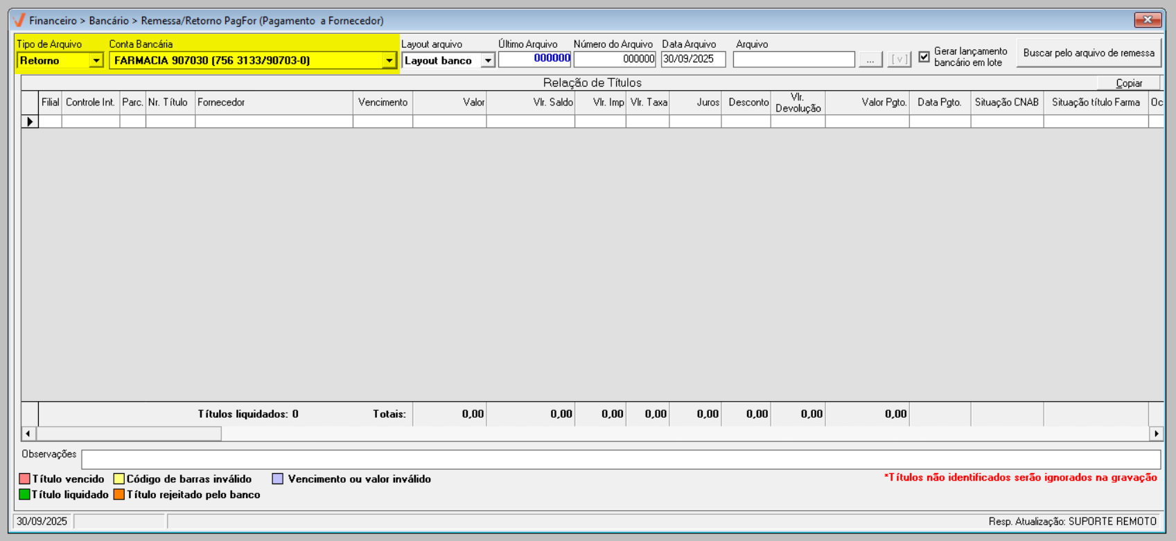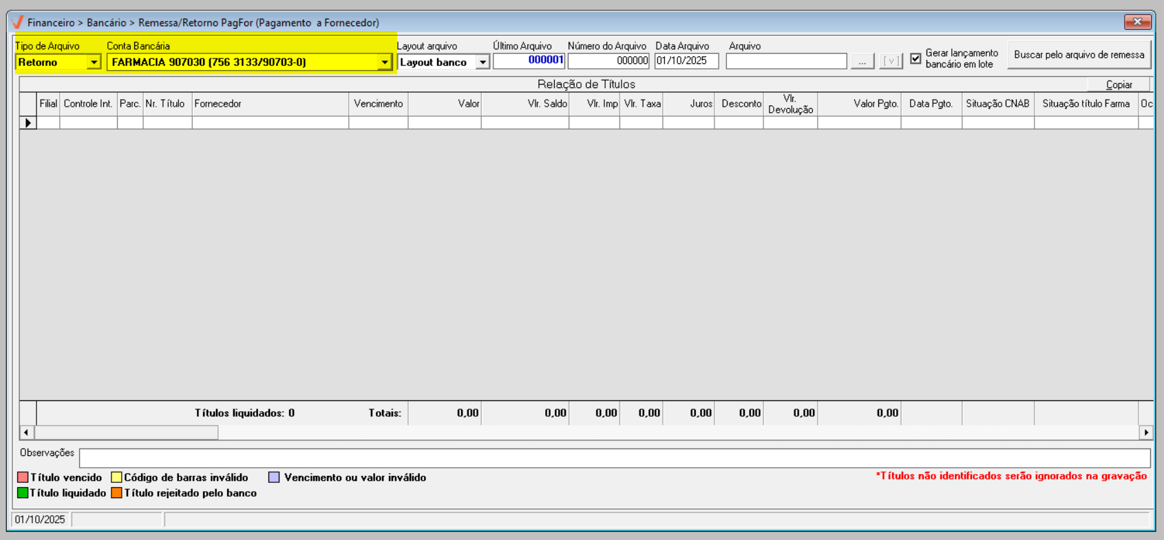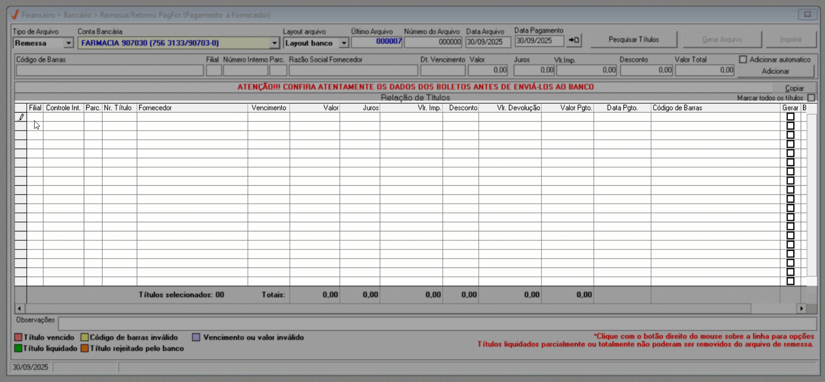 - Acesse o menu: Financeiro >> Bancário >> Remessa/Retorno PagFor (Pagamento a Fornecedor).