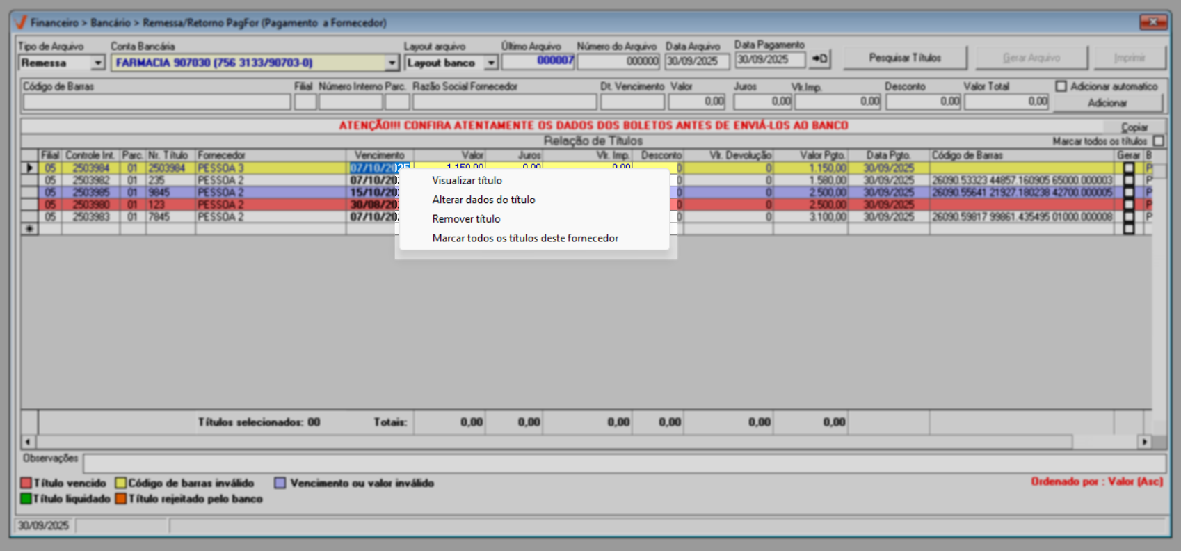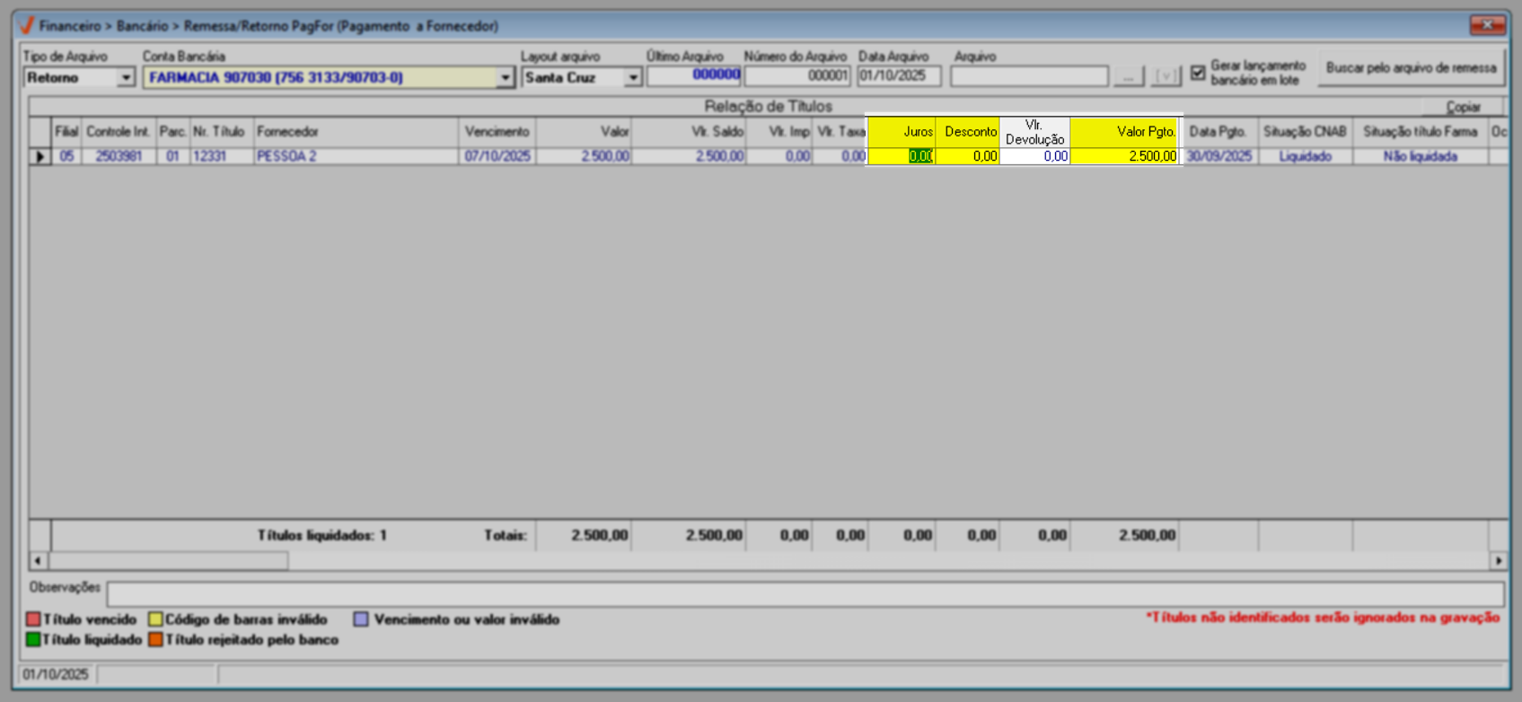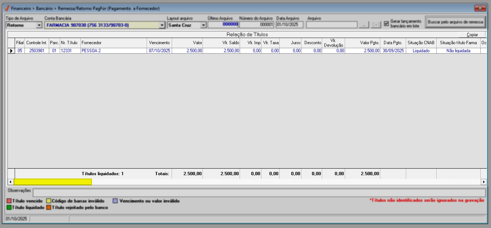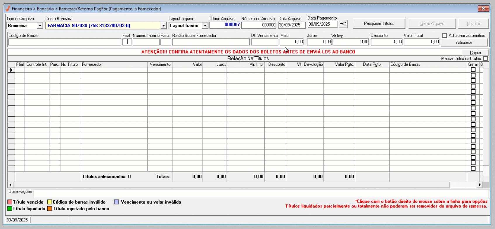 - Acesse o menu: Financeiro >> Bancário >> Remessa/Retorno PagFor (Pagamento a Fornecedor).