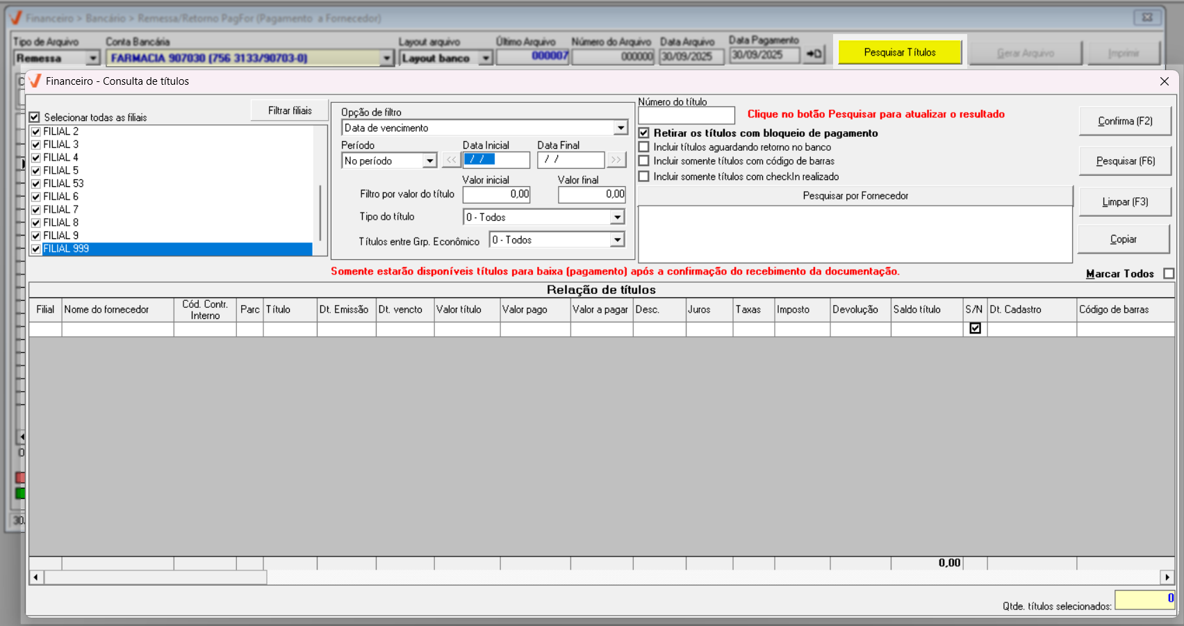 - Marcar todos os títulos deste fornecedor: Quando a relação de títulos listar um grande número de documentos, esta opção permitirá ao usuário, marcar de uma única vez, todos os registros identificados de um mesmo fornecedor, facilitando a geração da remessa.