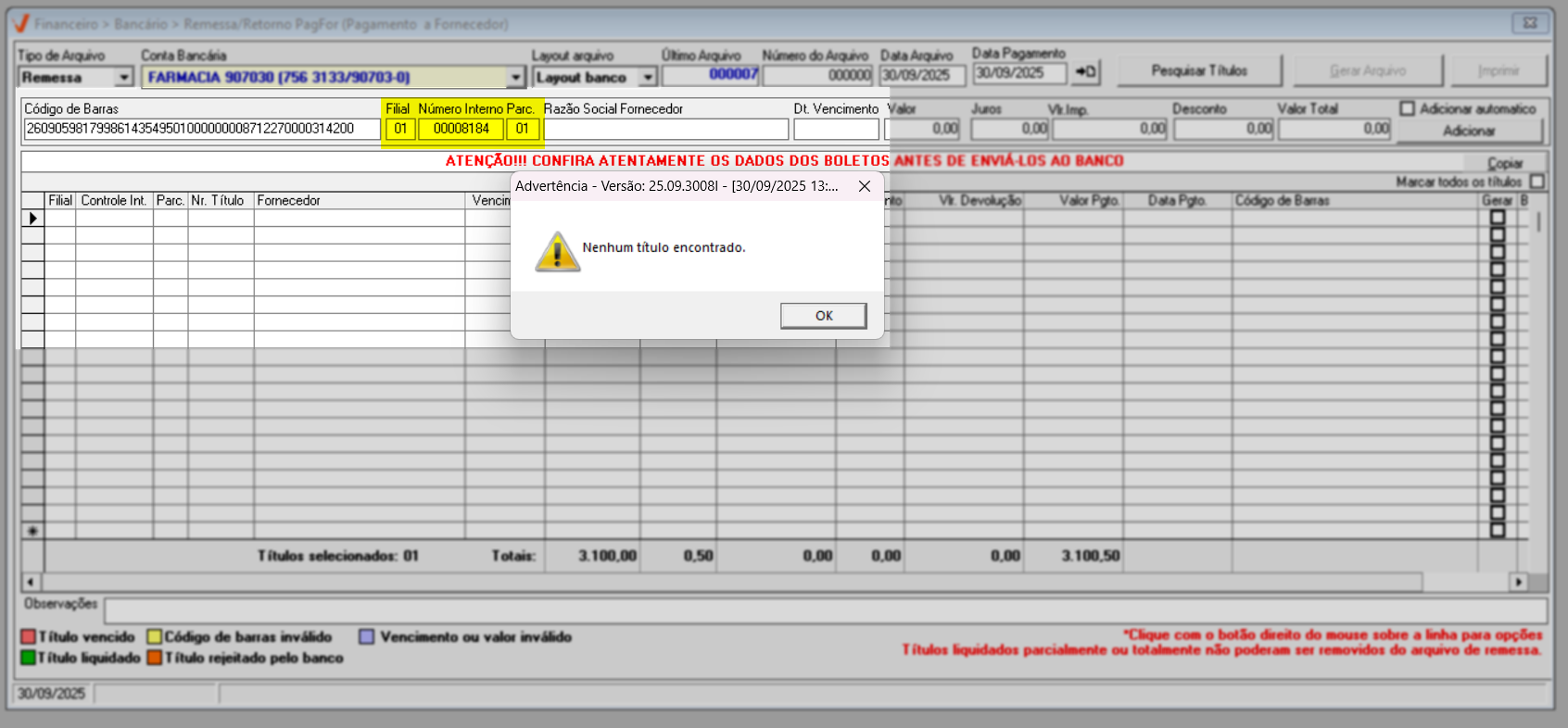 Se, ao informar o código de barras do boleto, o sistema não identificar nenhum documento correspondente, pode ser que o documento lançado esteja sem o código de barras registrado. Neste caso, preencha a filial do documento, o número interno (Código do título referenciado no contas a pagar) e o número da parcela. Se logo em seguida o sistema não carregar o documento, significa que o documento realmente não existe no sistema. Então será necessário realizar seu lançamento ou verificar os dados informados, pois a outra possibilidade é que o código tenha sido digitado incorretamente.