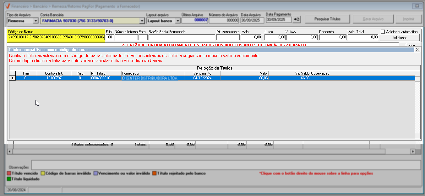 Se ao informar o código de barras, o sistema não encontrar nenhum documento, mas identificar que existe um título lançado com o mesmo valor e data de vencimento que consta no código de barras informado, será aberta esta tela: