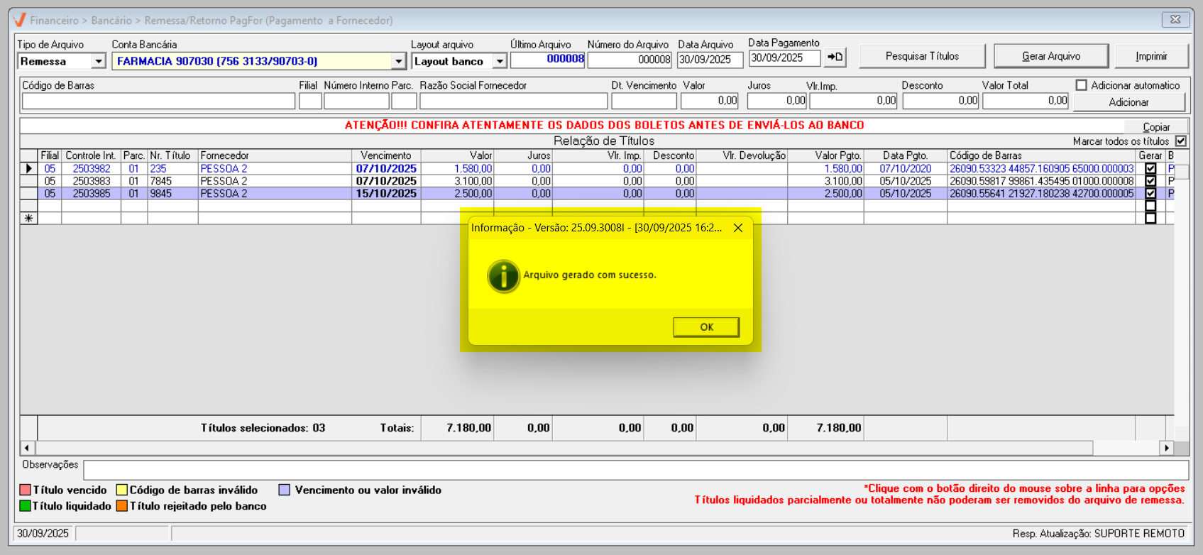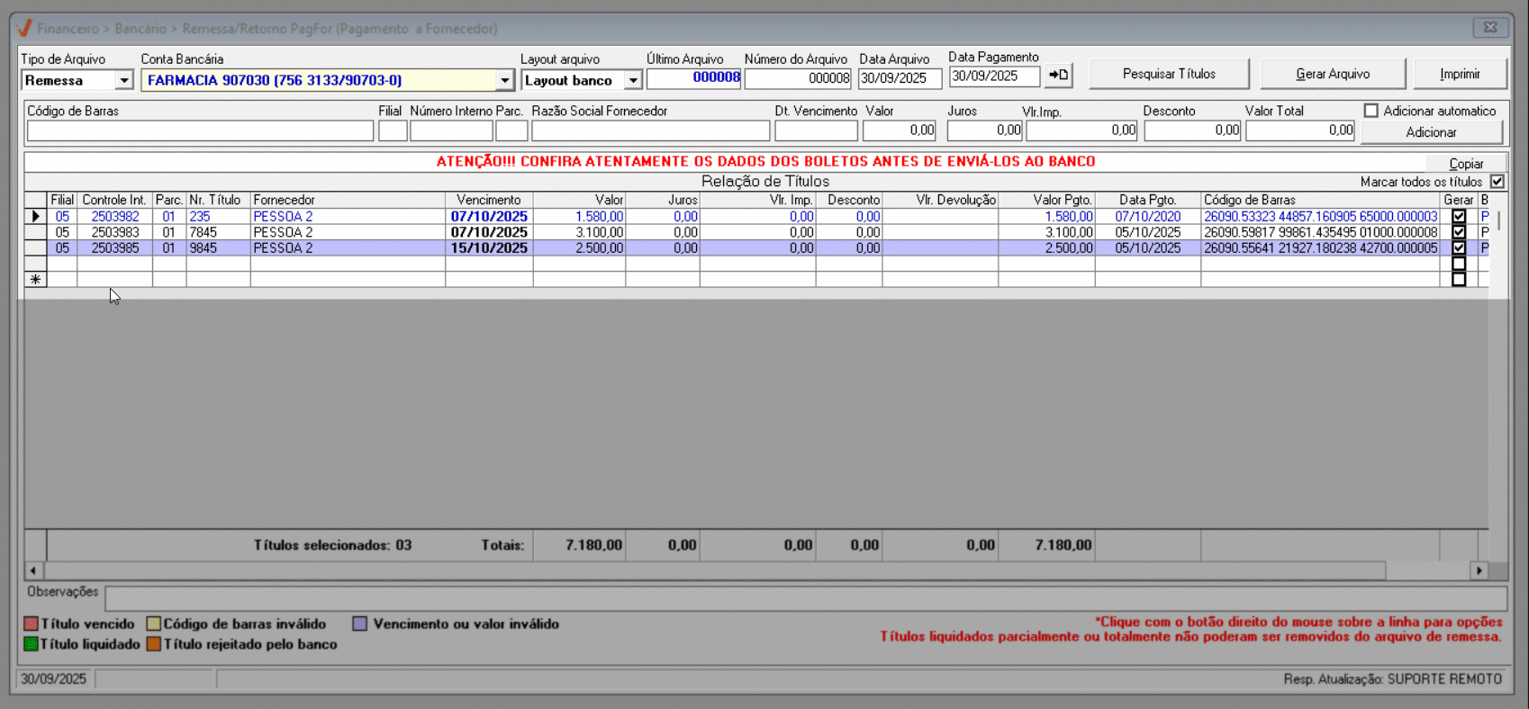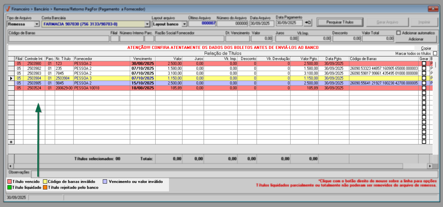 Vale ressaltar que apenas os documentos que possuem código de barras válidos, poderão compor a remessa que será gerada para o banco.